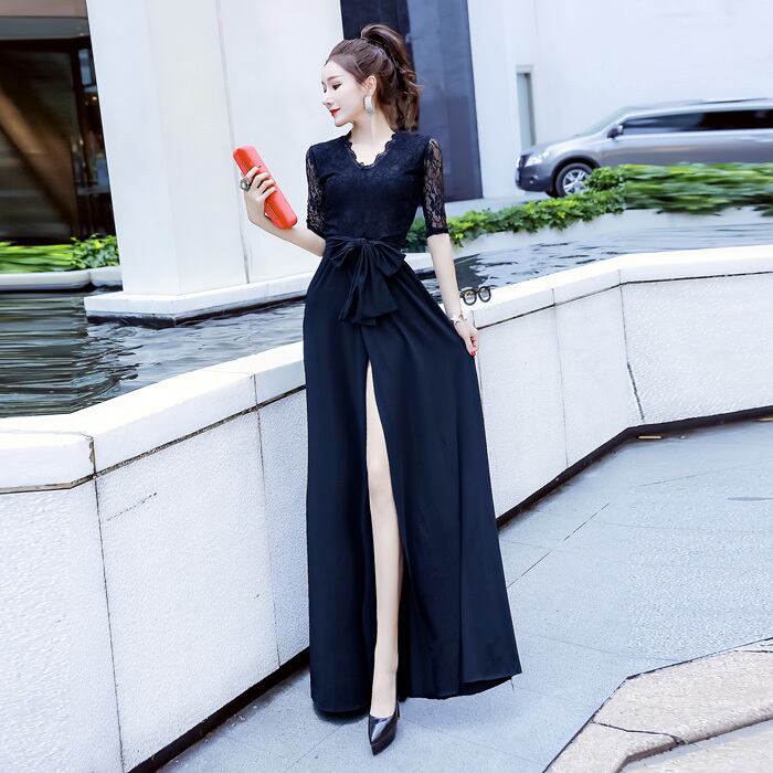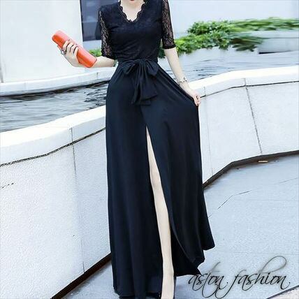 ドレスワンピース ワンピース ドレス Vネック レース ドッキングワンピース シースルー リボン スリット入り 5分袖 MH1064
