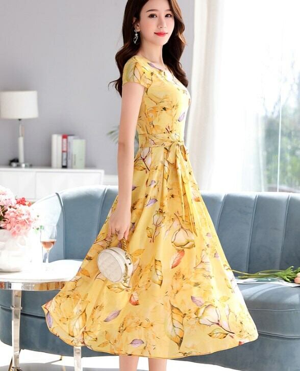 ワンピース 春夏 花柄 フラワー シフォンワンピ ミモレ丈 Vネック フレアスカート ガーリー ウエストリボン イエロー ab1261