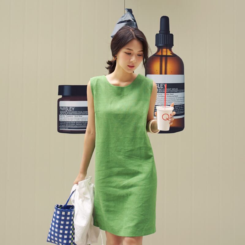 サイドスリット ノースリーブ ワンピース 膝丈 リネン ラウンドネック 夏 シンプル 無地 ママコーデ ママファッション きれいめ サイズ豊富 MH1074