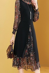 ワンピース ドッキングワンピ フェイクツーピース 花柄 フリル ハイネック シック ミディアム丈 シフォンワンピース 体型カバー ab1278