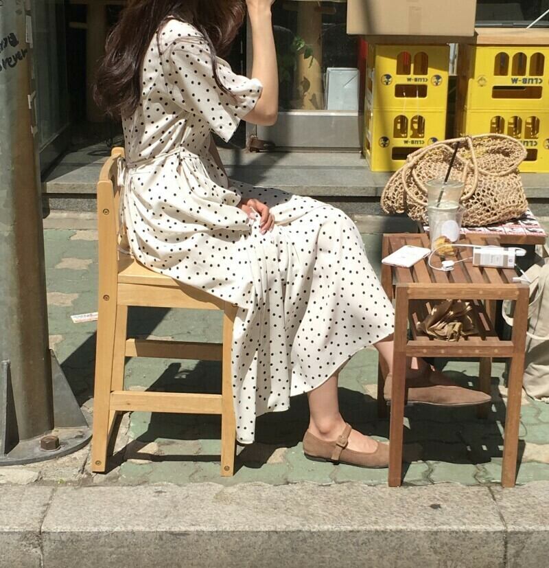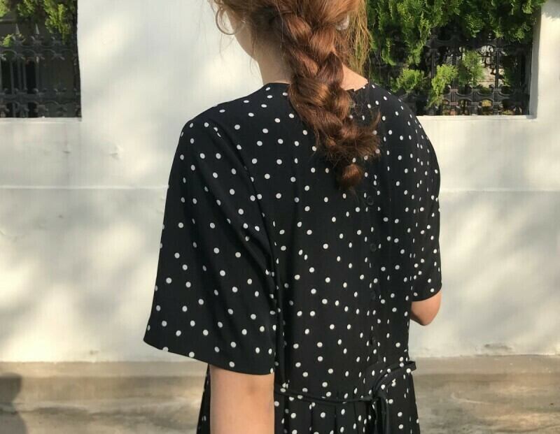 ワンピース ロング丈 ロングワンピース ドット 水玉 半袖 ウエストリボン ふんわり 大人かわいい ガーリー 春夏 yi955