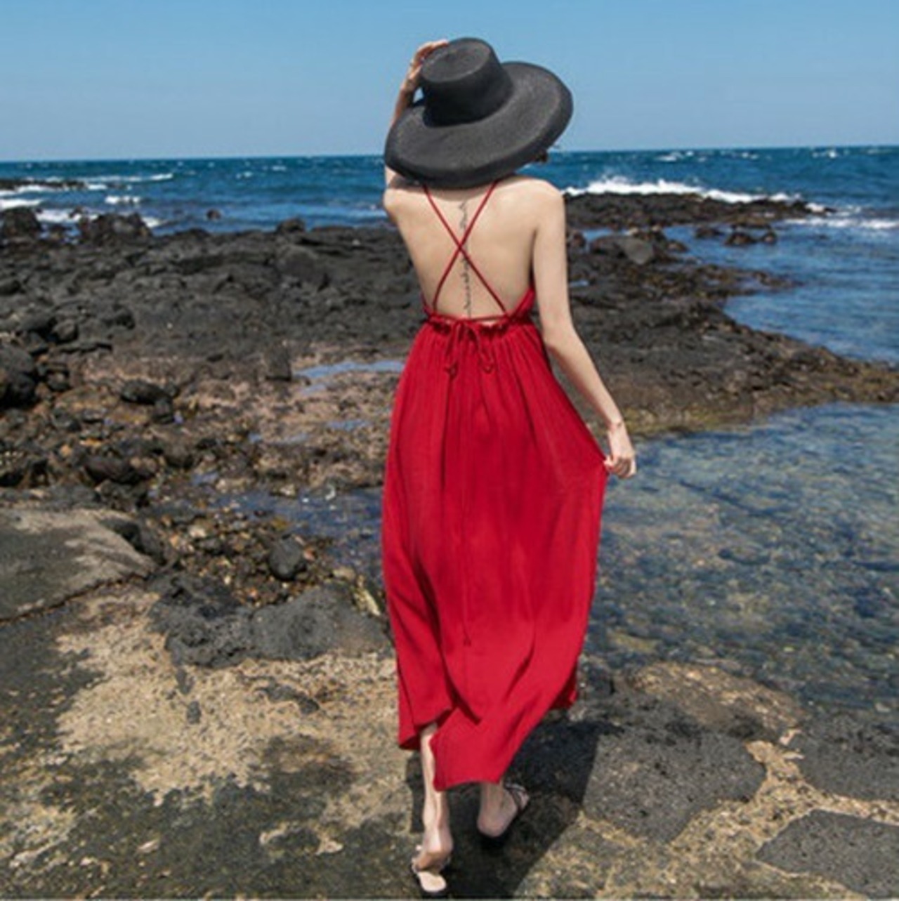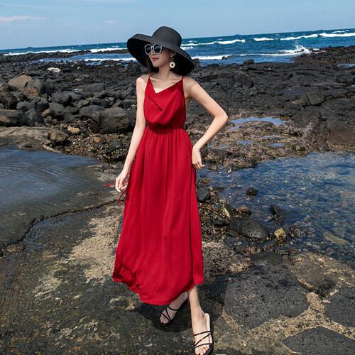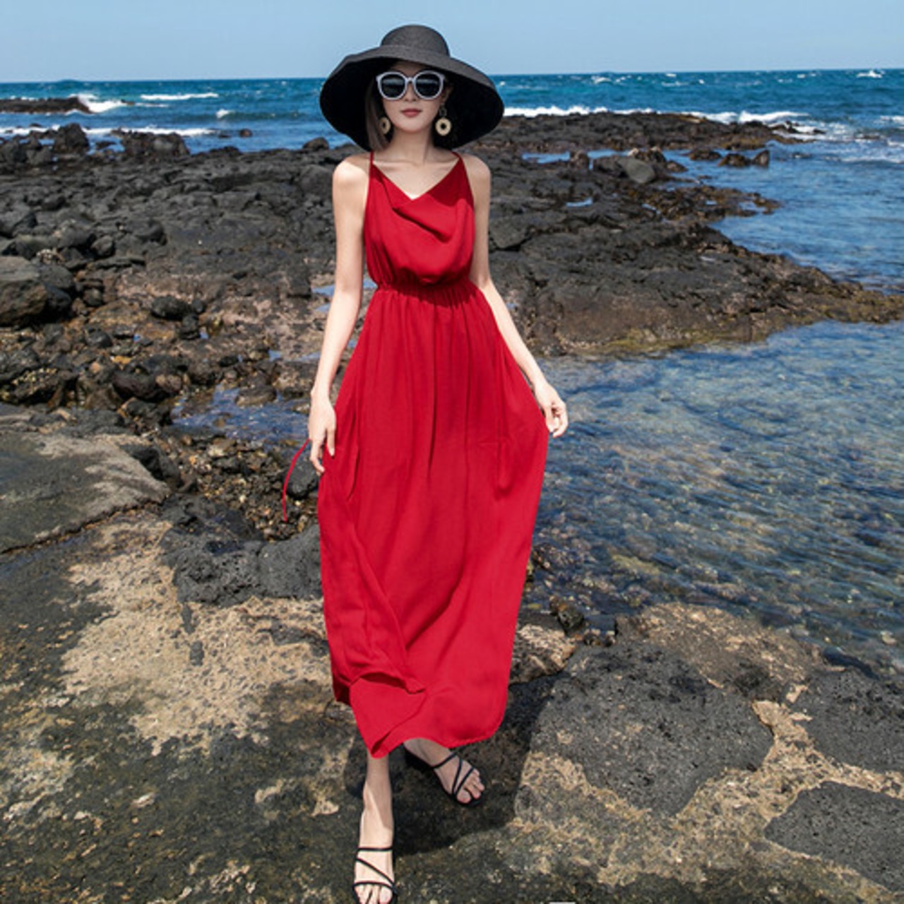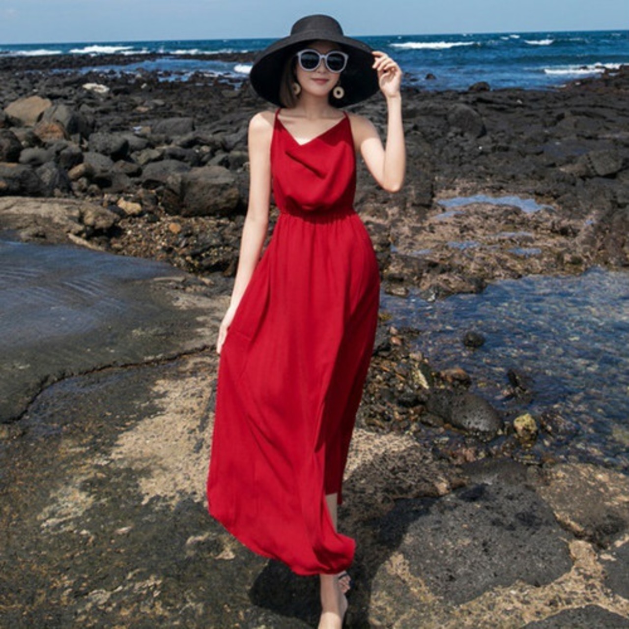 ワンピース ロング丈 ロングワンピース マキシ丈 無地 キャミソール バッククロス リゾート エレガント 大人 赤 ハイウエスト シフォン 夏yi959