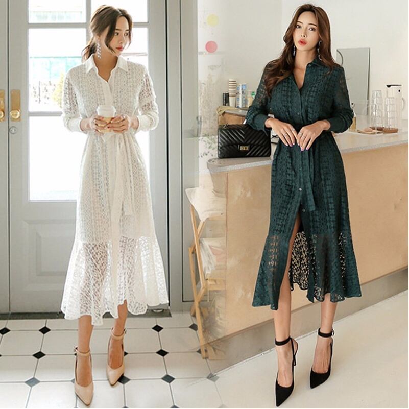 花柄レース ウエストマーク シャツワンピース フィッシュテール ワンピース 長袖 清楚 ガーリー フェミニン MH1150