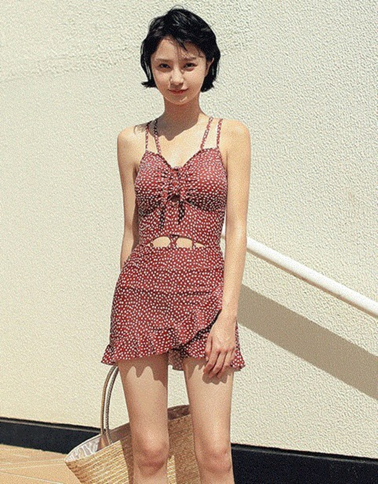 水着 ワンピース水着 レディース レトロ 水玉 ドット フリル フェミニン バッククロス 体型カバー ガーリー ab1306