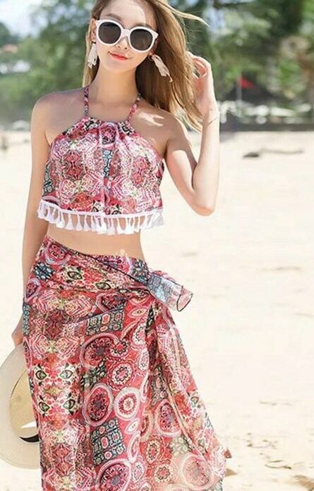 水着 ビキニ ビスチェ 3点セット レディース ボヘミアン パレオ ホルターネック バッククロス 体型カバー エスニック ab1309