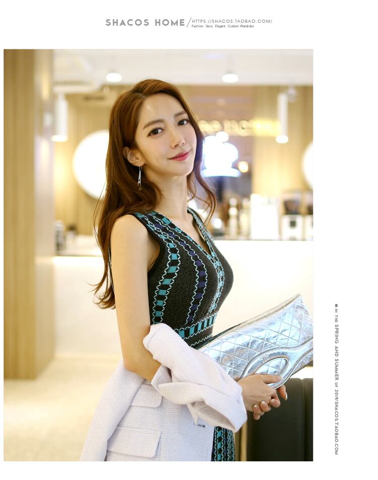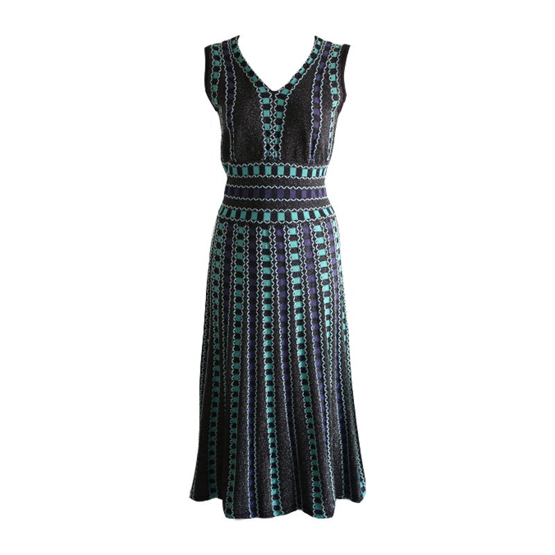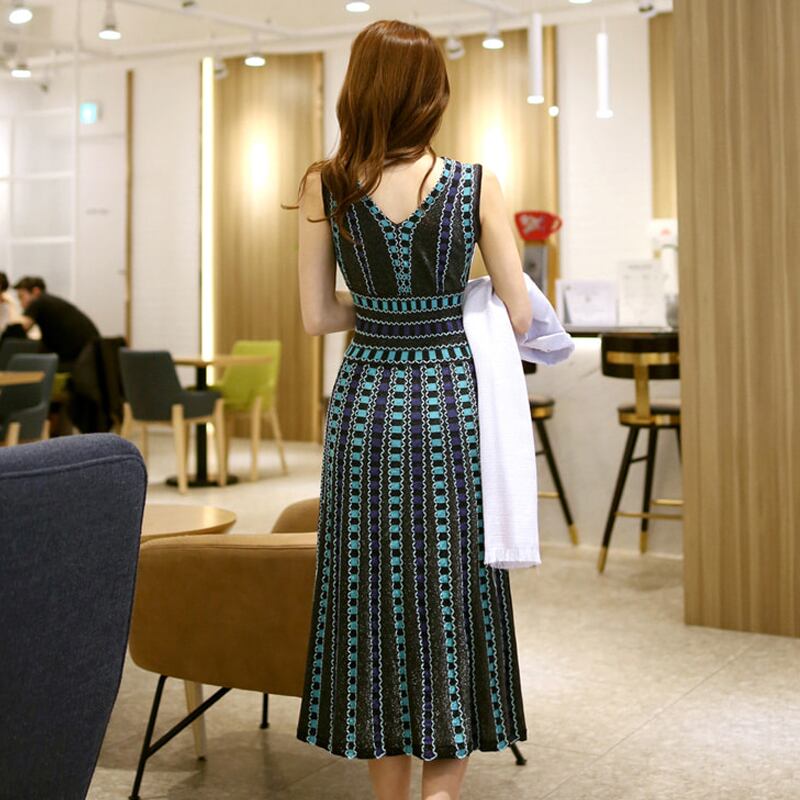 サマーニット ハイウエスト Vネック ワンピース ノースリーブ 膝丈 フレアワンピース 夏 清楚 二次会 パーティー 記念日 デート MH1187