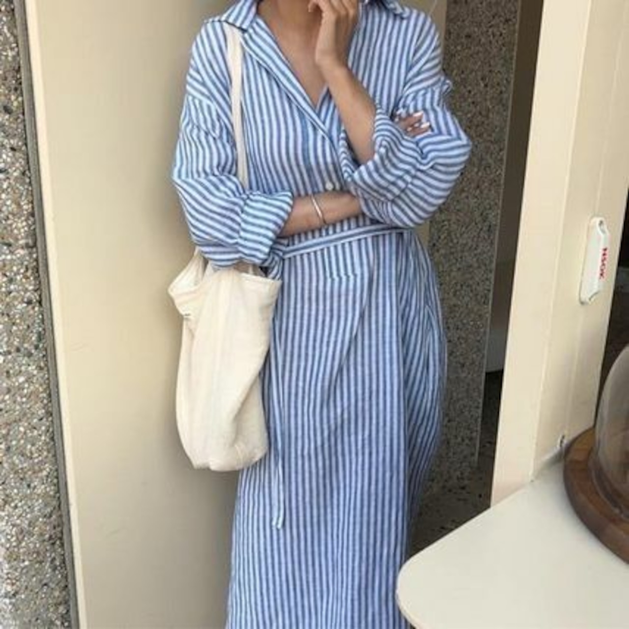 ストライプ シャツワンピース シャツワンピ しましま ロング丈 長袖 爽やか 清楚 きれいめ カジュアル 夏 ウエストマーク MH1195