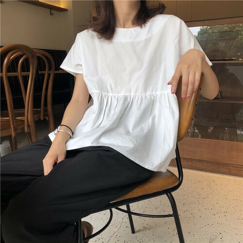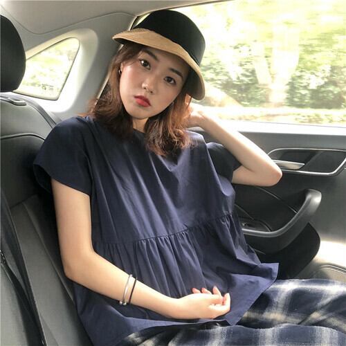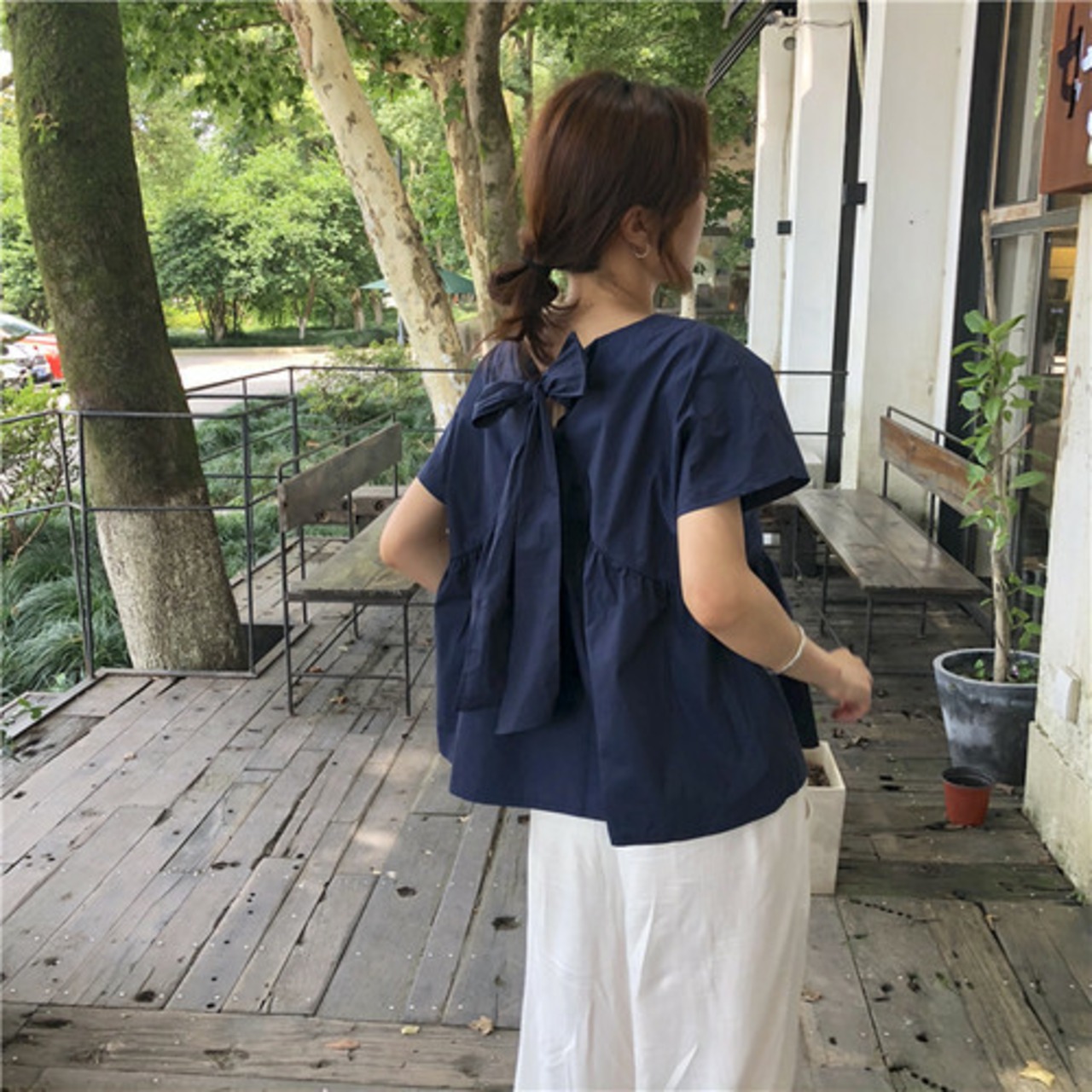 ブラウス カットソー 半袖 無地 バックリボン バックデザイン ハイウエスト 切り替え ラウンドネック ゆったり ママ 女子会 デート ガーリー フレア 夏 yi990