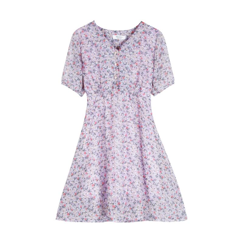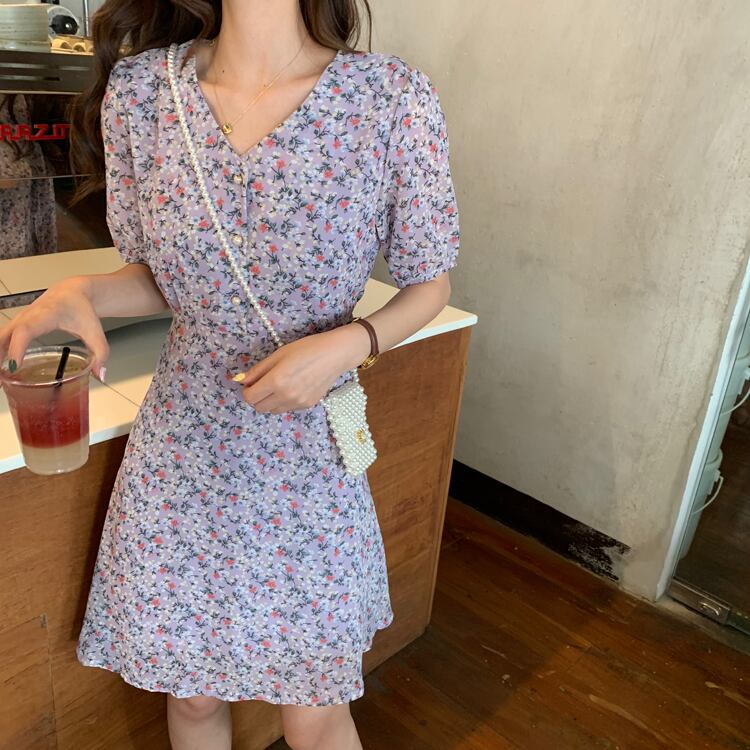 花柄 ワンピース 半袖 ミニ丈 パフスリーブ 前ボタン Vネック フェミニン ガーリー 大人可愛い 大人女子 MH1285