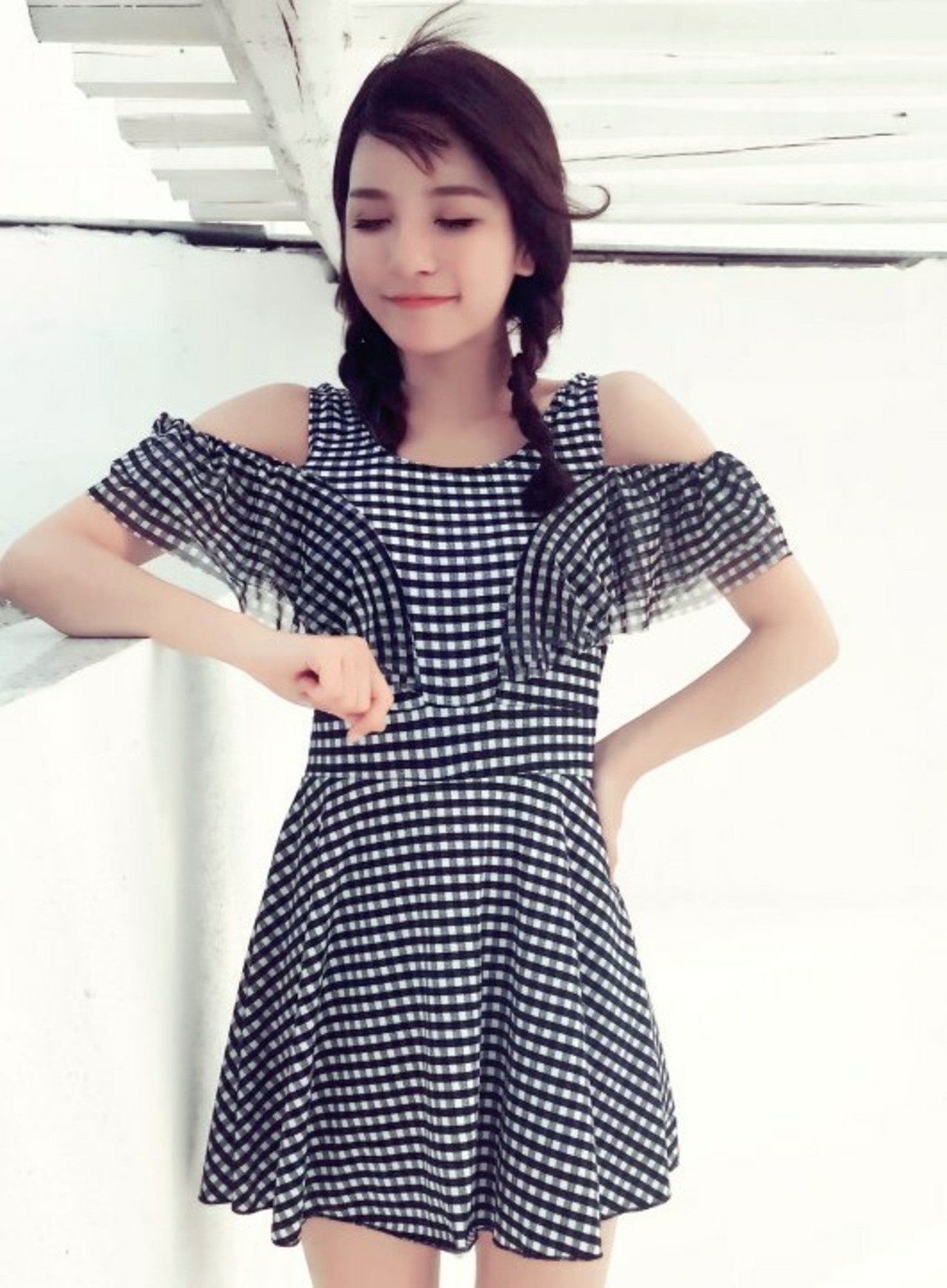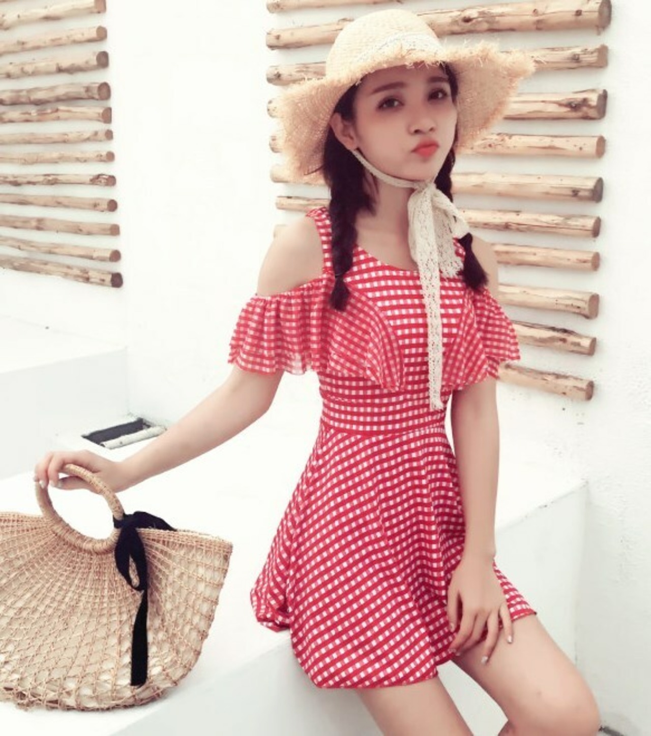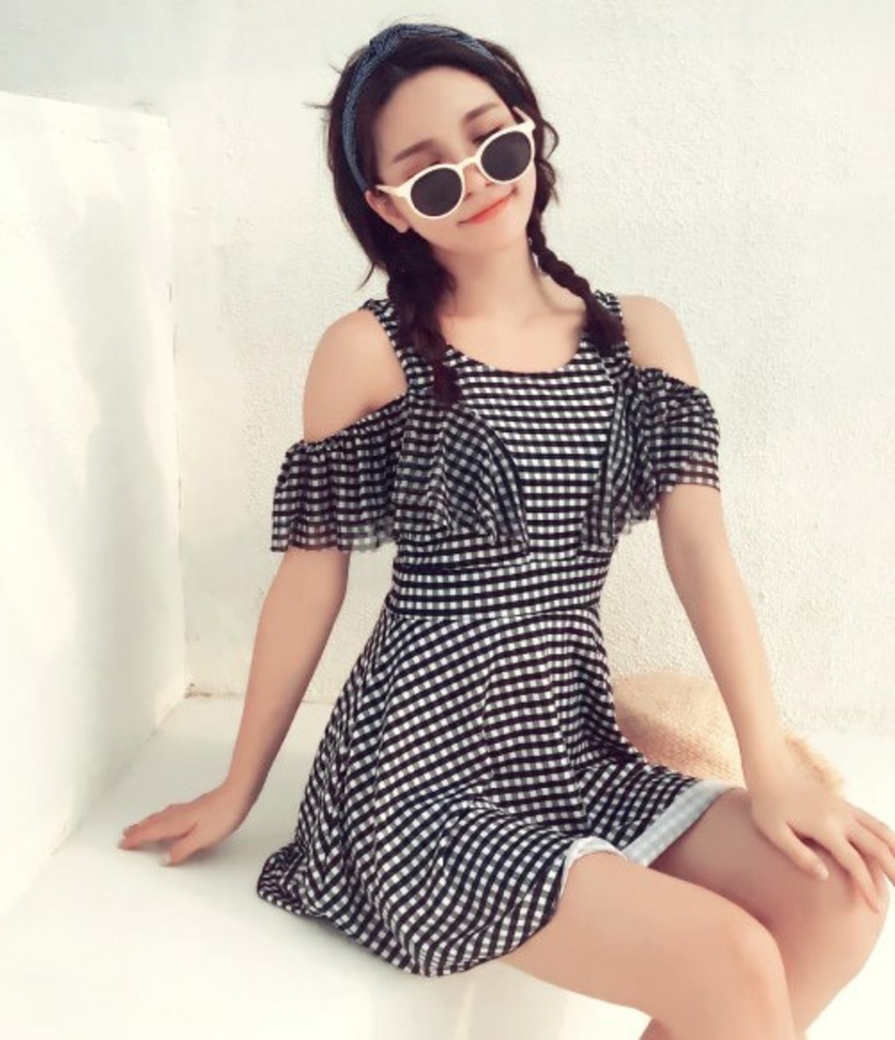 水着 ワンピース水着 レディース オフショルダー 体型カバー ギンガムチェック フリル ハイウエスト ガーリー ab1393