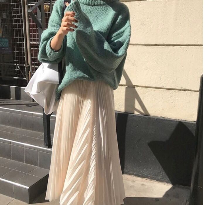 ニットとプリーツスカートのセットアップです。