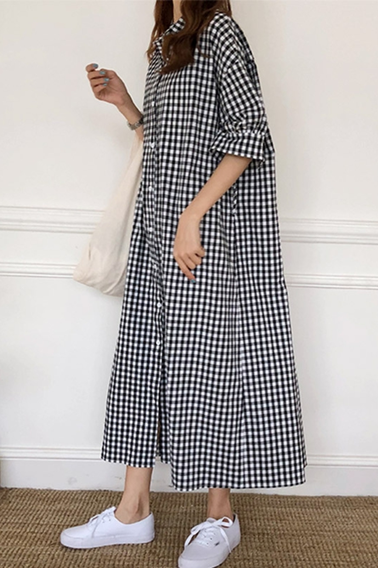 ギンガムチェックのシャツワンピース。