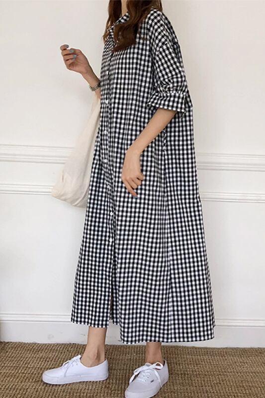 シャツワンピース ギンガムチェック ワンピース ロング ゆったり 大きめサイズ 体型カバー ガーリー ナチュラル お出かけ ママファッション MH1409