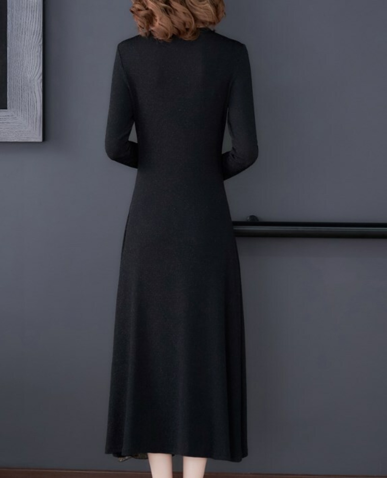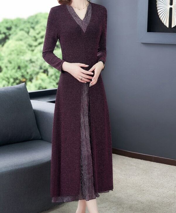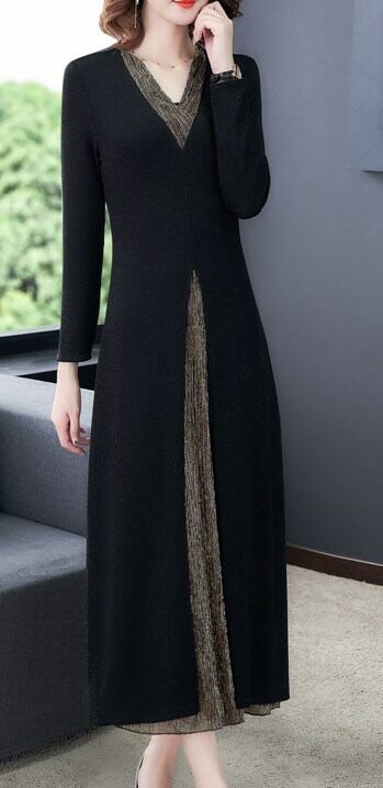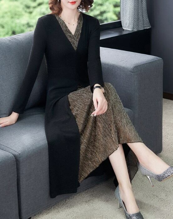 ワンピース レディース ロング丈 秋冬 バイカラー Vネック レトロ シック スリムデザイン ab1436