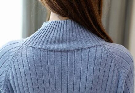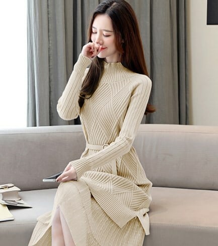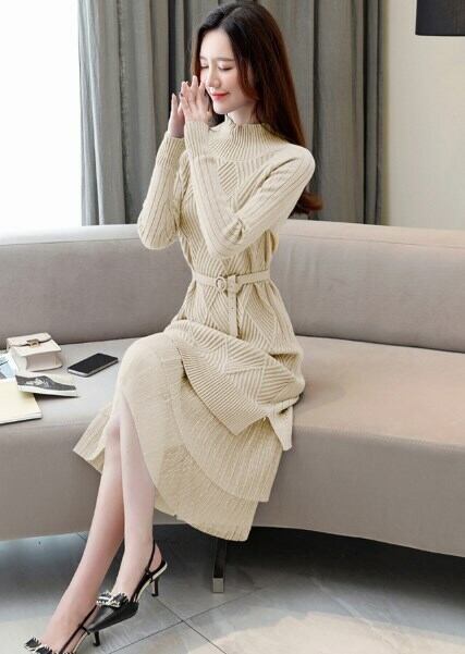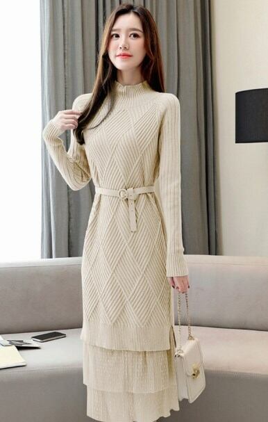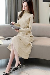 ブルーMサイズ1つ即納可能!!ワンピース ロング丈 レディース ニットワンピース 秋冬 ドッキングワンピ ハイネック ギャザー レース ab1446