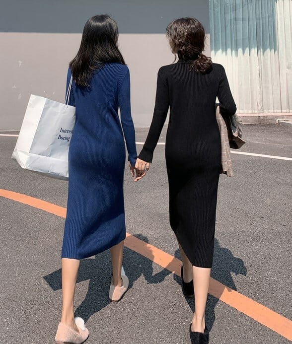 ワンピース ニットワンピース レディース ひざ丈 秋冬 タートル ハイネック 長袖 無地 ab1467