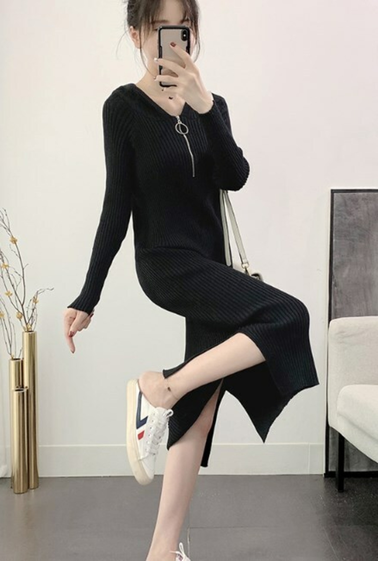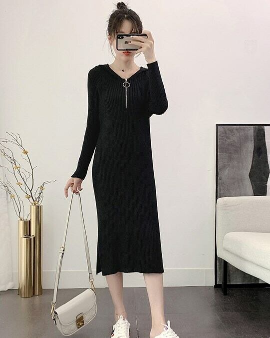 ワンピース ニットワンピース ミモレ丈 ニット レディース 秋冬 スリット 無地 フード ブラック ab1470
