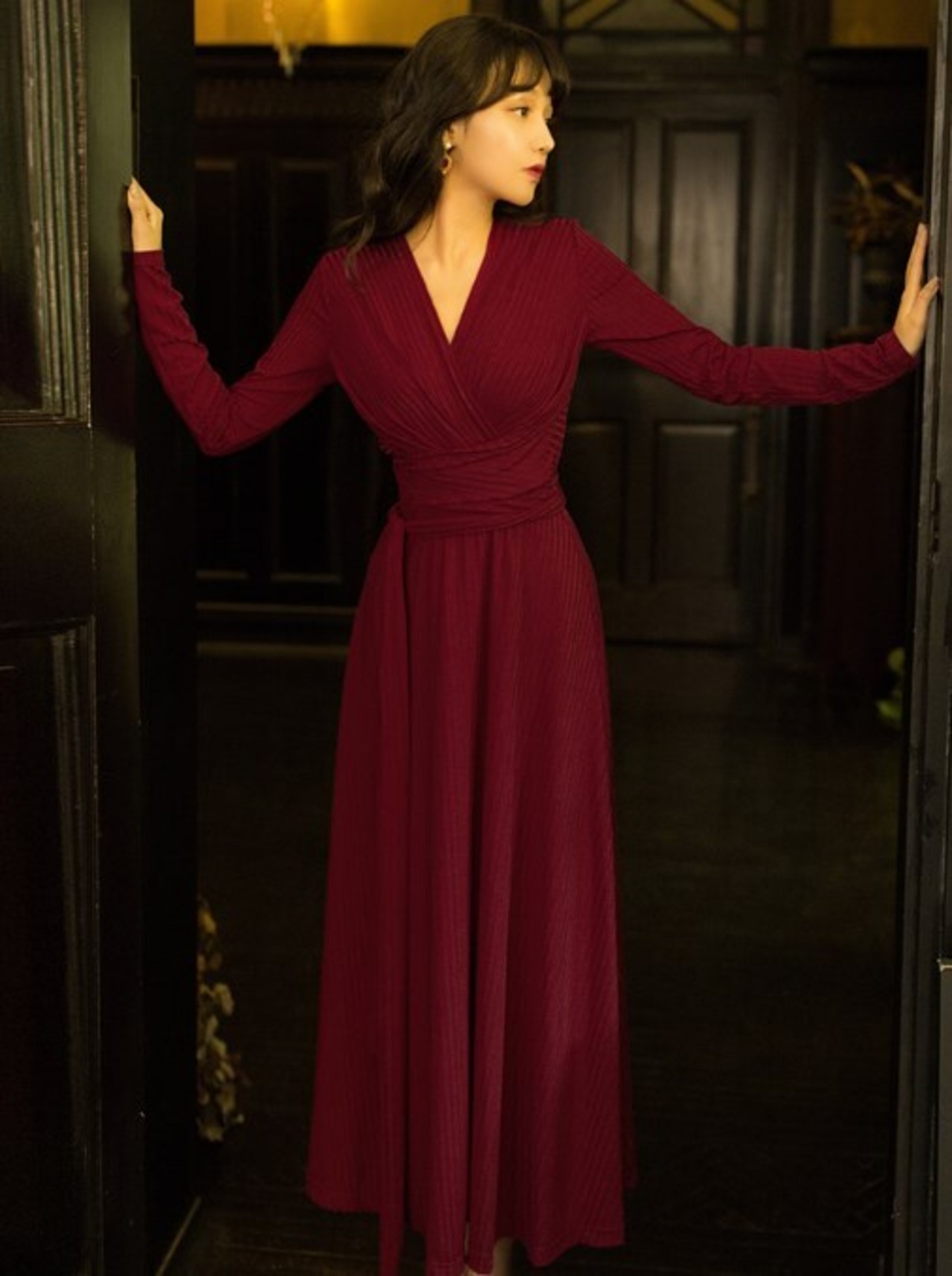 ワンピース レディース ロング丈 レトロ Vネック ニットワンピ ニット ドレス 無地 エレガント ab1471
