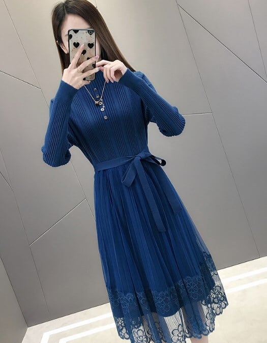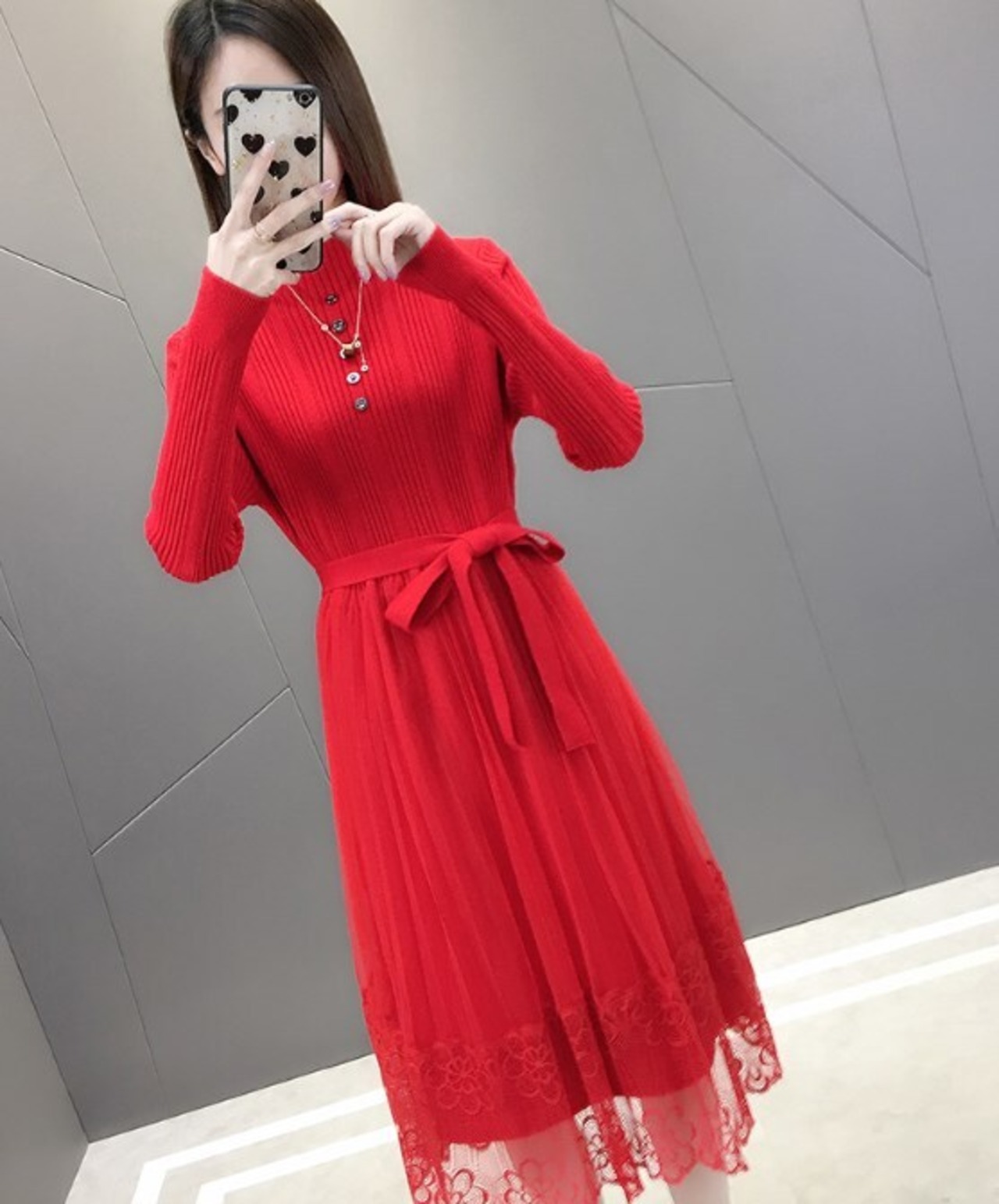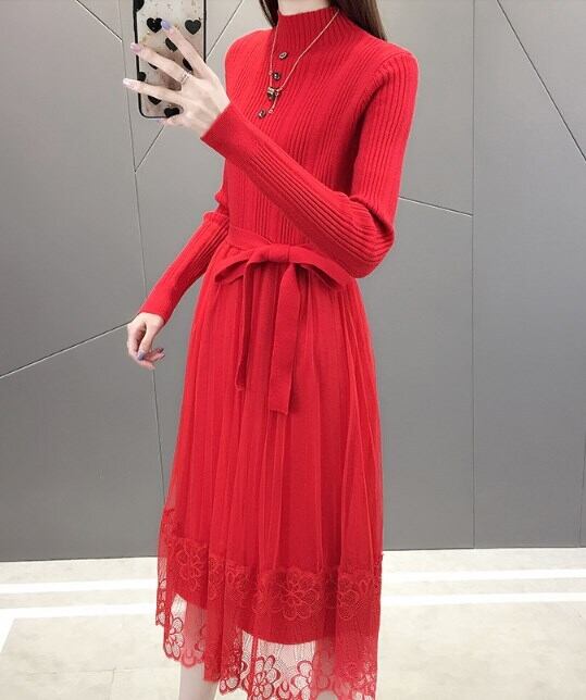 ワンピース ドレス ニットワンピ レース ドッキングワンピ 異素材 レディース 秋冬 花レース ab1515