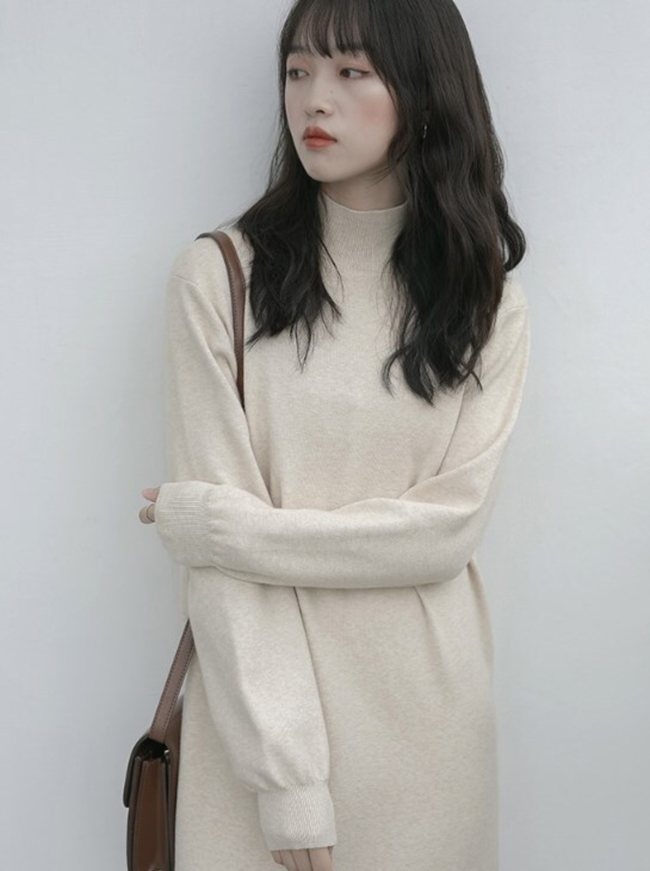 ニット ワンピース ロングセーター ニットワンピ ロング丈 ハイネック レディース 秋冬 無地 ソリッドカラー アプリコット ab1535