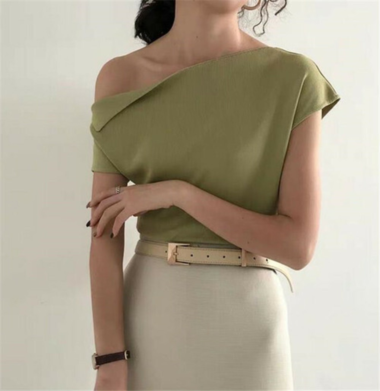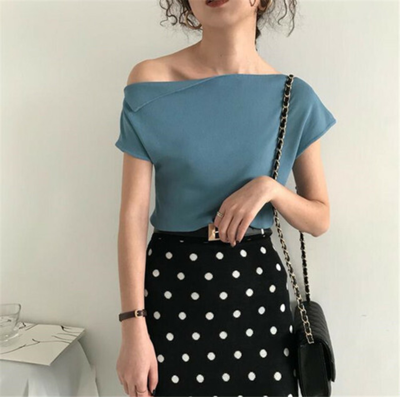 ニット ニットトップス 半袖 ワンショルダー 無地 きれいめ シンプル フェミニン セクシー 大人 ガーリー デート yi1120