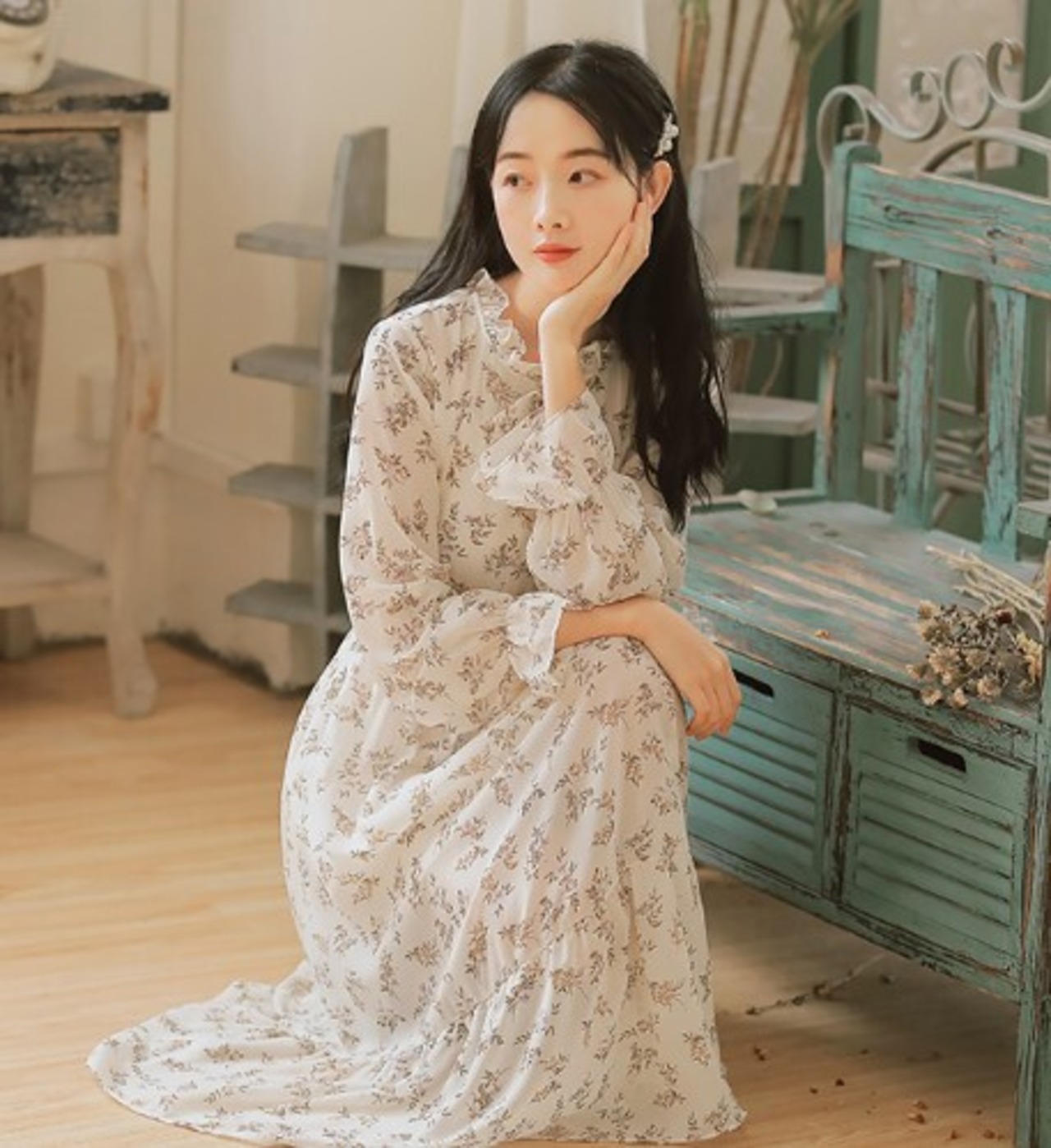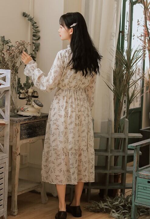 ワンピース 春ワンピ レディース ロング丈 花柄 長袖 フリル フェミニン レトロ ハイウエスト Aライン ab1576