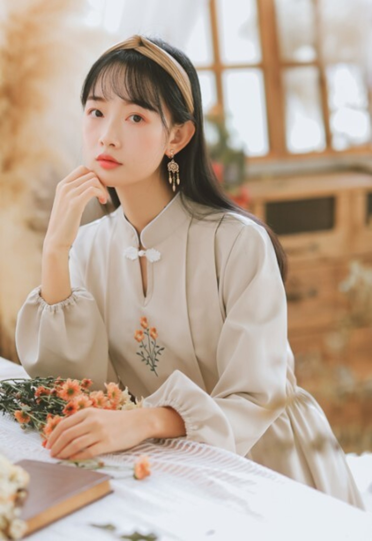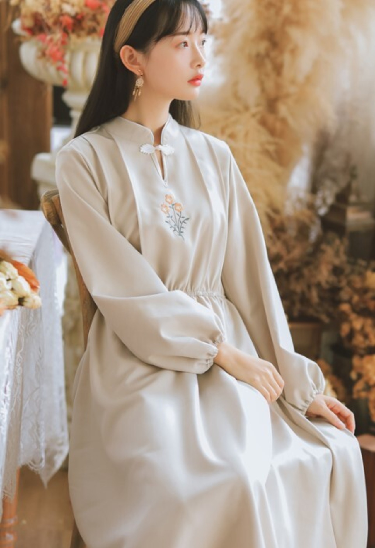 ワンピース 春秋 春ワンピ レディース ミモレ丈 長袖 チャイナ風 花刺繍 レトロ フレアスリーブ ab1577