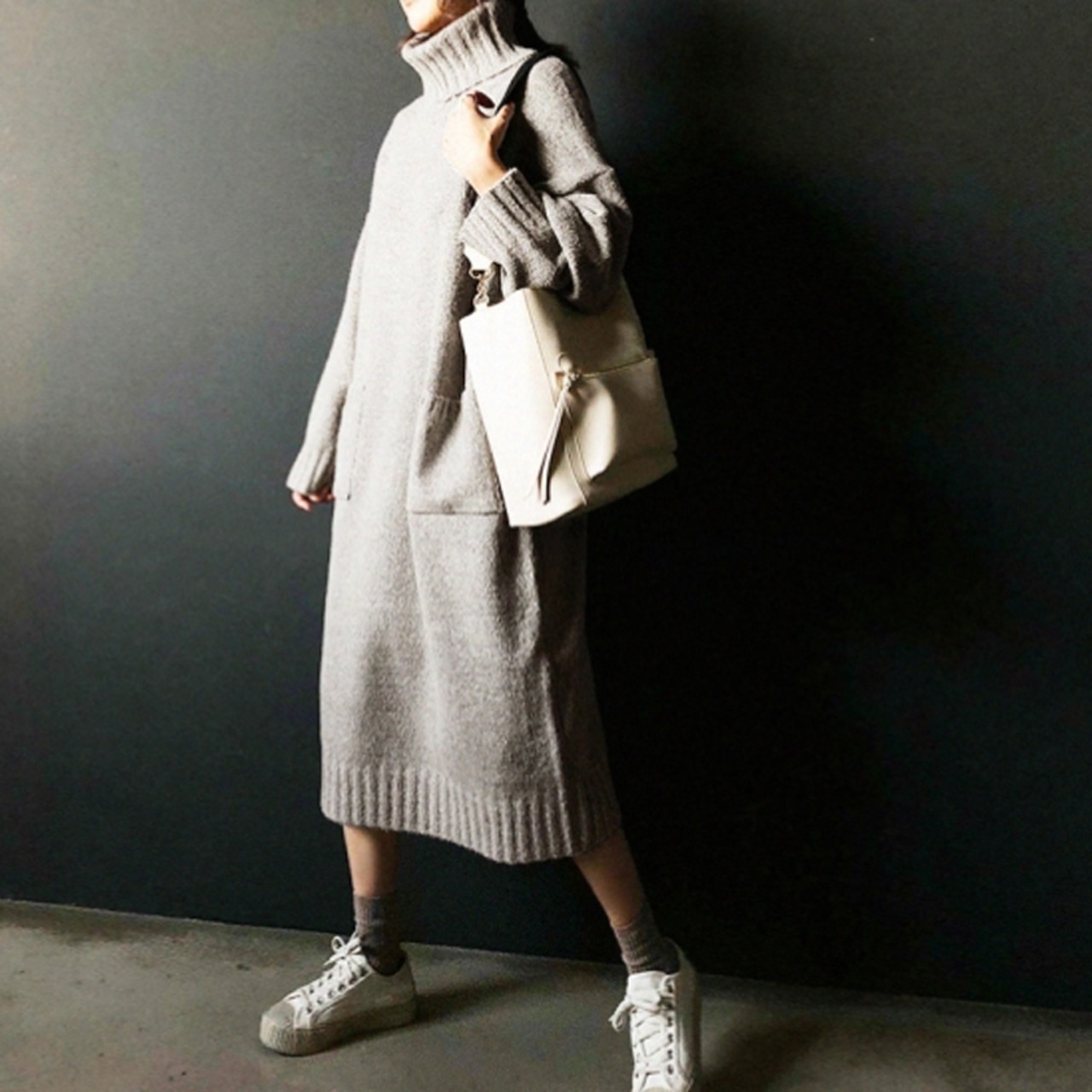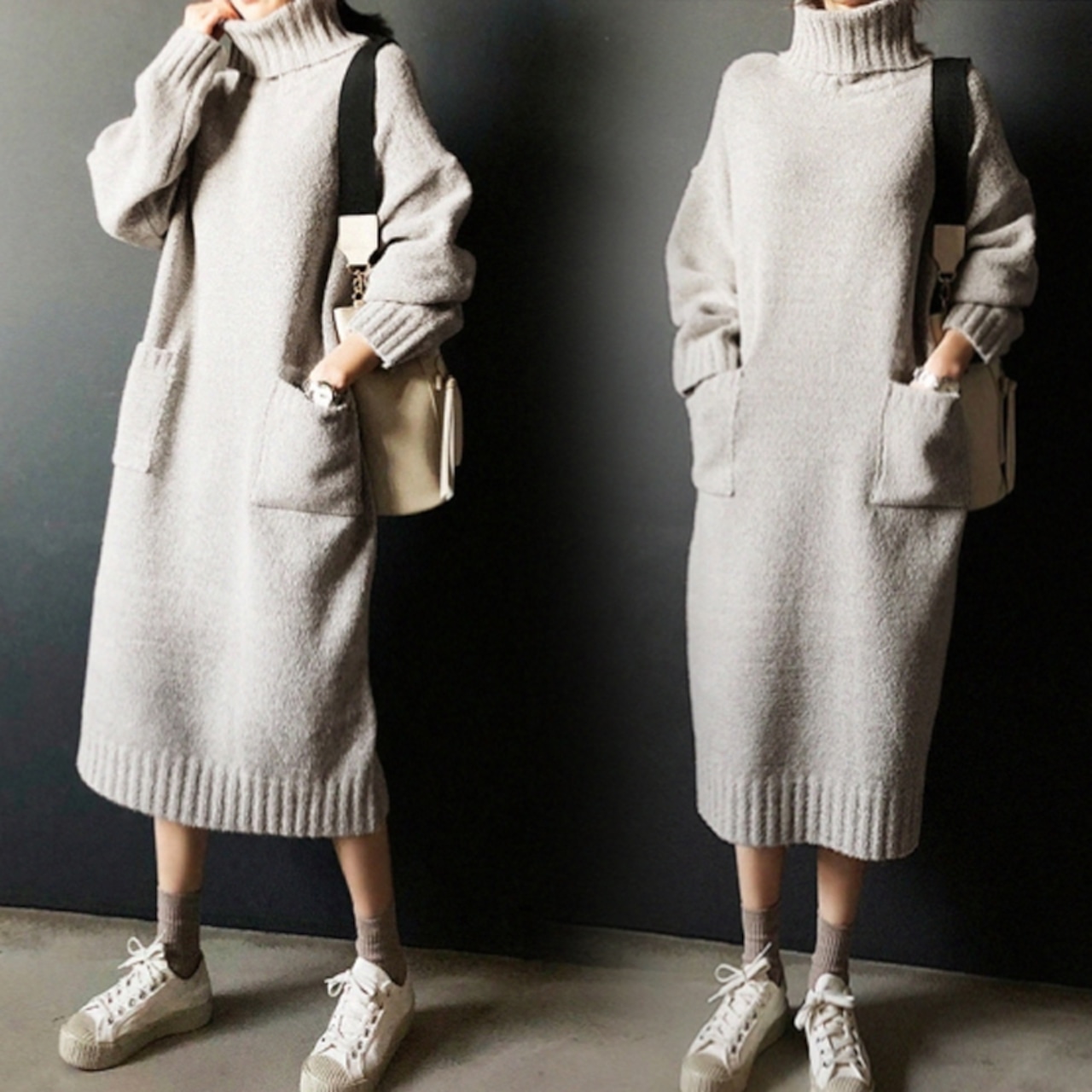 ニットワンピース ロング丈 タートルネック ニット セーター ポケット付き 体型カバー ゆったり カジュアル ママコーデ ママ会 MH1637