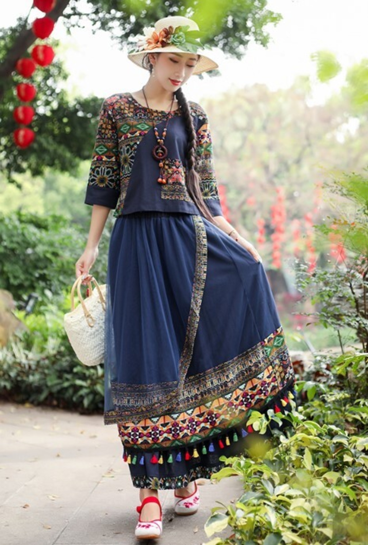 セットアップ ツーピース レディース ロング丈 エスニック 大きいサイズ 五分袖 ラウンドネック ゆったり 民族風 ネイビー ab1586