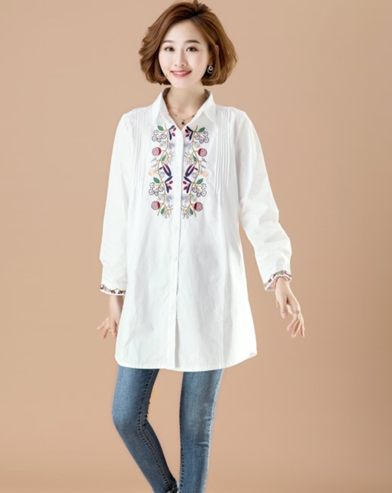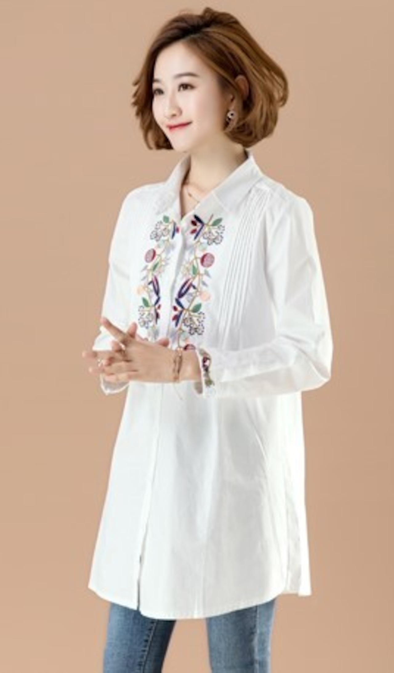 シャツ ブラウス レディース 春夏 長袖 ロング丈 花刺繍 オフィス ママコーデ カジュアル 大きいサイズ ホワイト ab1588