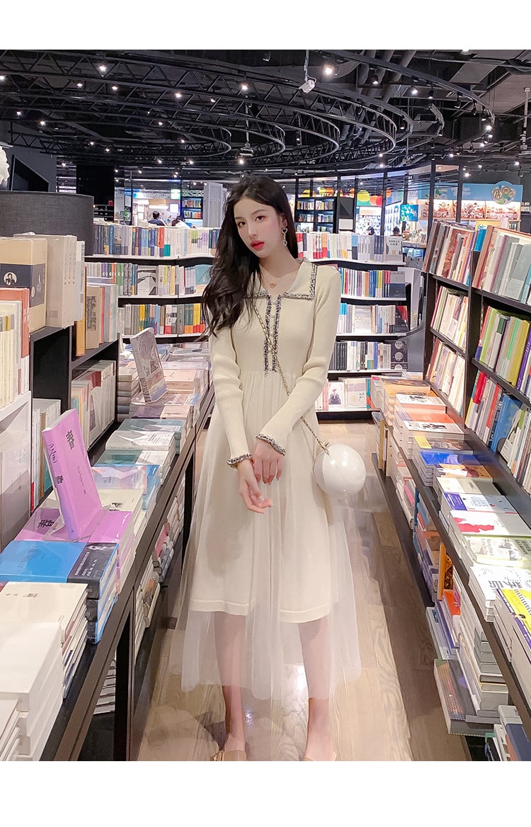 チュールワンピース ニットワンピース 襟付き ビジュー付き チュールスカート 清楚 フェミニン デート ママコーデ ママ会 MH1654