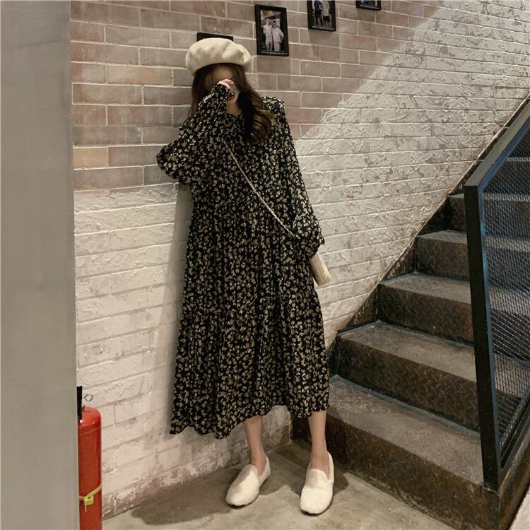 花柄フリルワンピース 花柄 ロング丈 フリル レトロ 襟付き フェミニン ママコーデ デート ママ会 MH1704