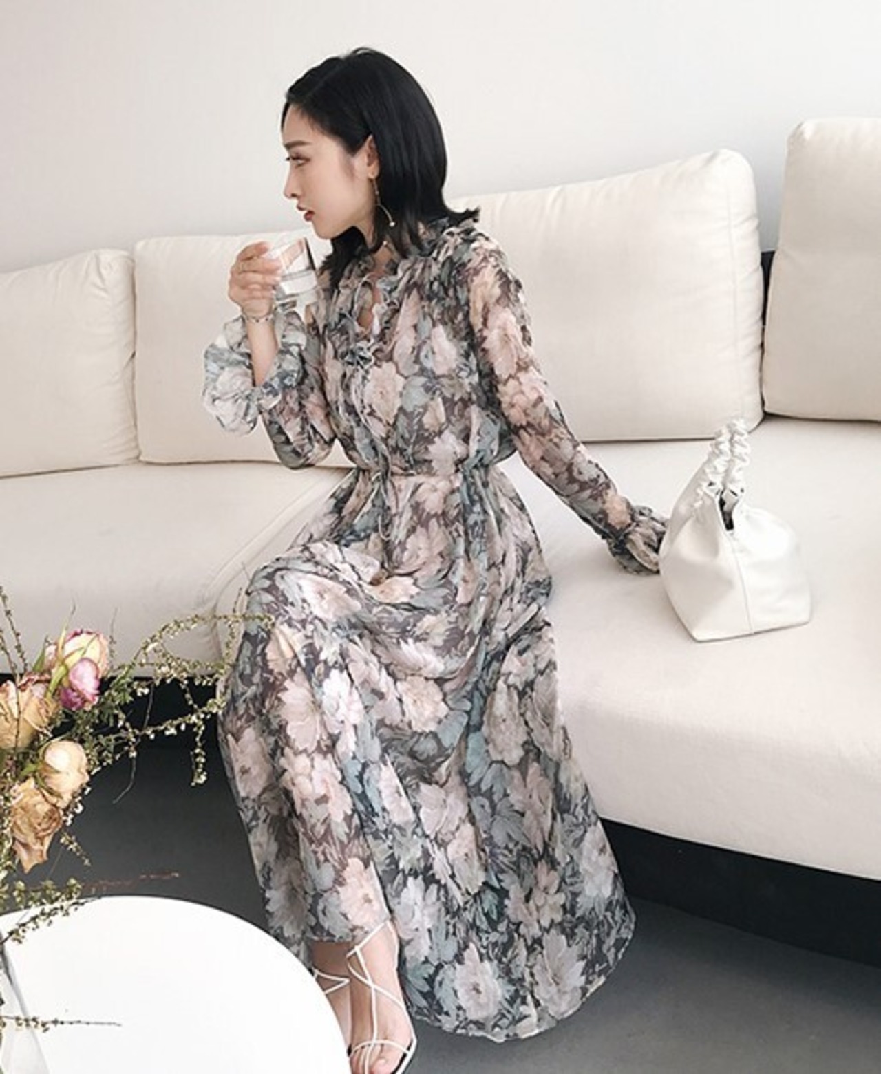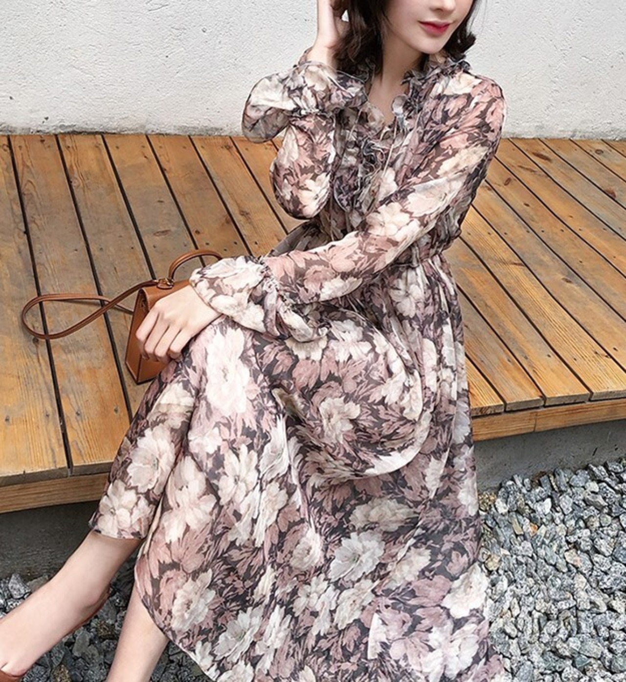 ワンピース 春ワンピ レディース ロング丈 花柄 長袖 フリル Aライン フローラル ハイウエスト エレガント ab1606