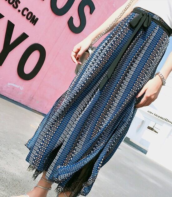 ワイドパンツ パンツ レディース ロング丈 ハイウエスト ウエスタン ボヘミアン レース ストライプ スリット ダンス 春夏 ベルトリボン ab1610