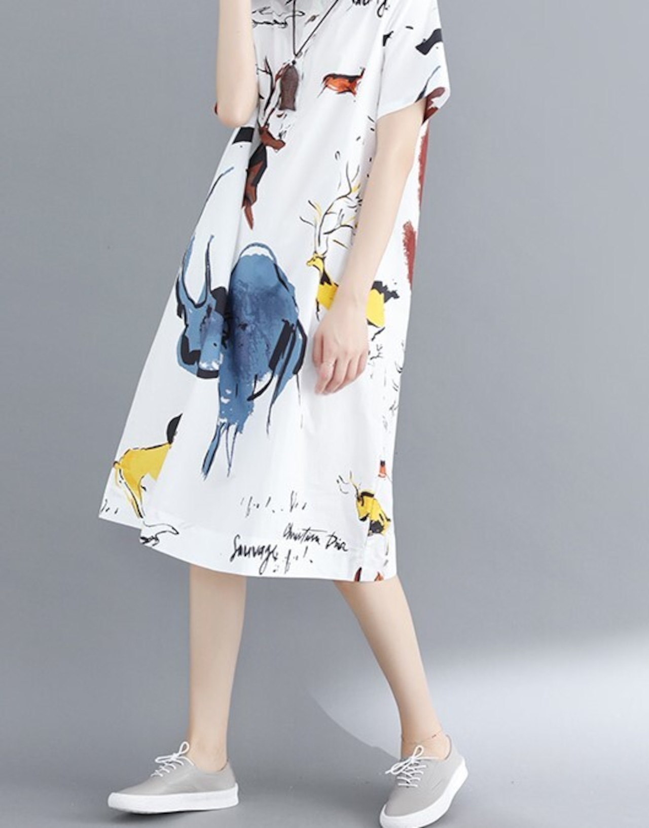 ワンピース 春夏ワンピ レディース ひざ丈 半袖 アニマル ゆったり 動物 カジュアル ab1629