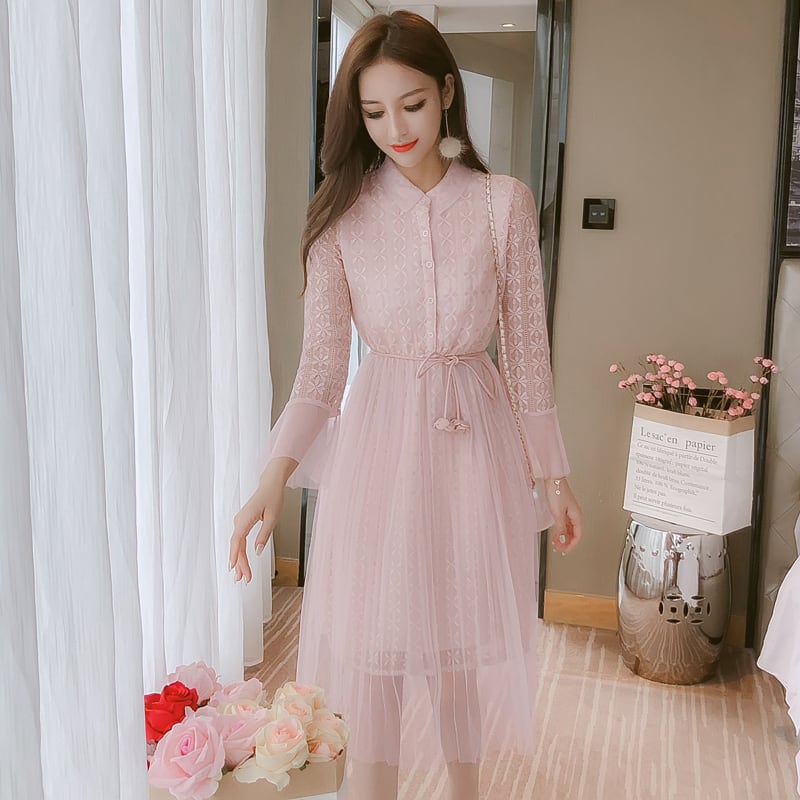 パーティードレス ドレスワンピース 長袖 レース 清楚 ピンク 二次会 パーティー お呼ばれ 記念日 デート MH1764