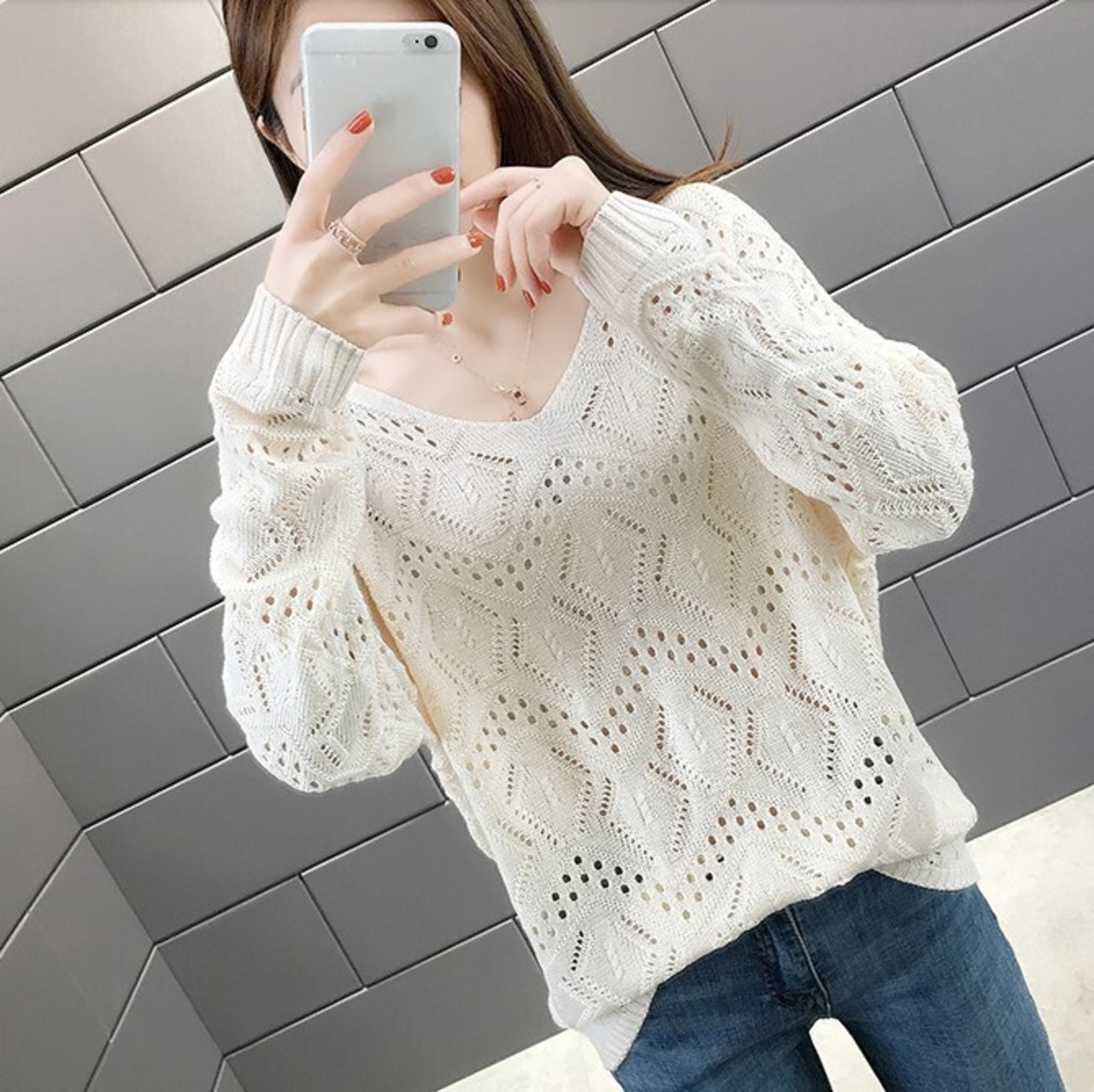 セーター 春秋 レディース ニット サマーセーター 長袖 Vネック ゆったり 透け模様 オフィス ホワイト ab1652