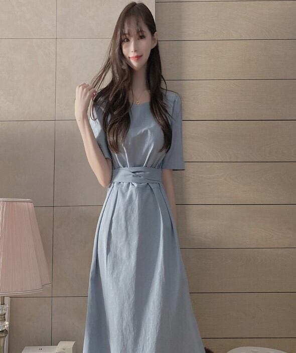 ワンピース レディース 春夏 ひざ丈 無地 Aライン レトロ ハイウエスト ふんわり ママコーデ 20代 30代 ab1683