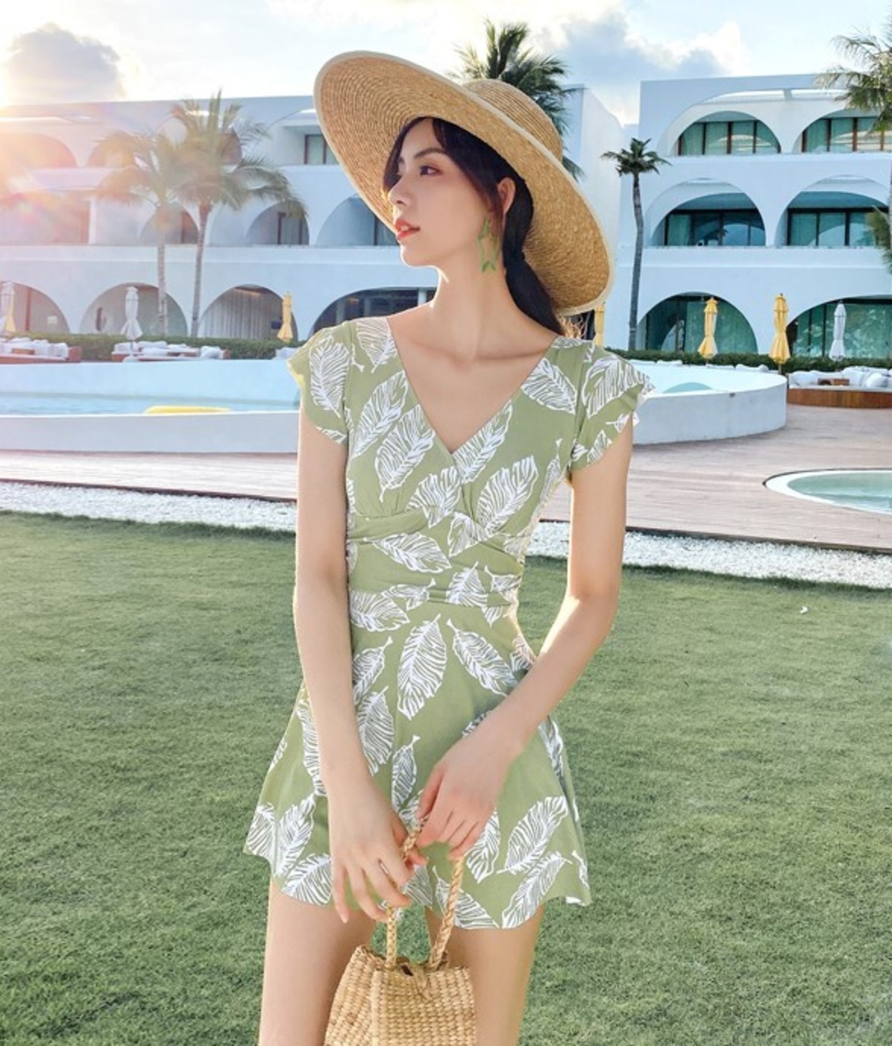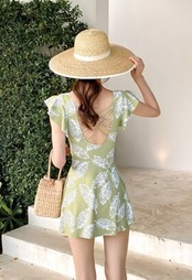 ワンピース水着 水着 レディース バッククロス ボタニカル Vネック 体型カバー フリル ママ水着 大人ガーリー ab1716
