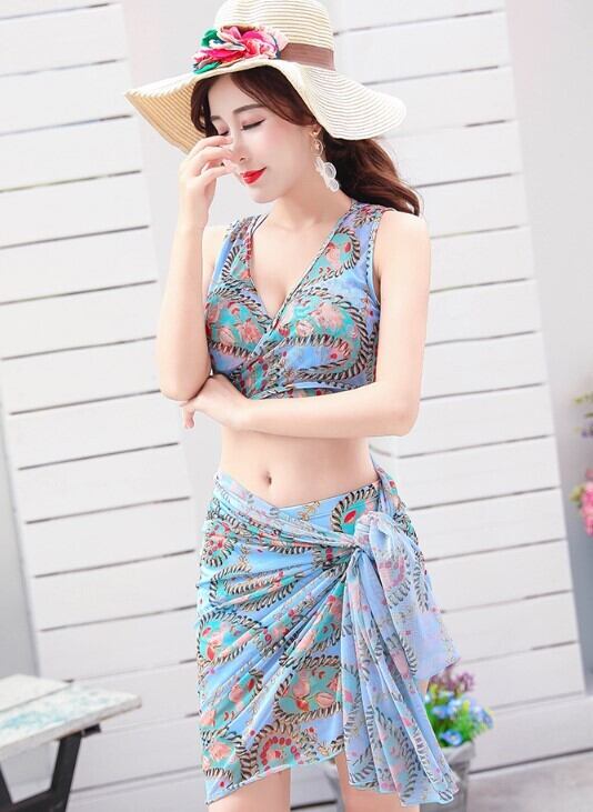 水着 スリーピース ビキニ レディース 3点セット エスニック Vネック タンキニ 体型カバー パレオ ママ水着 ブルー ab1740