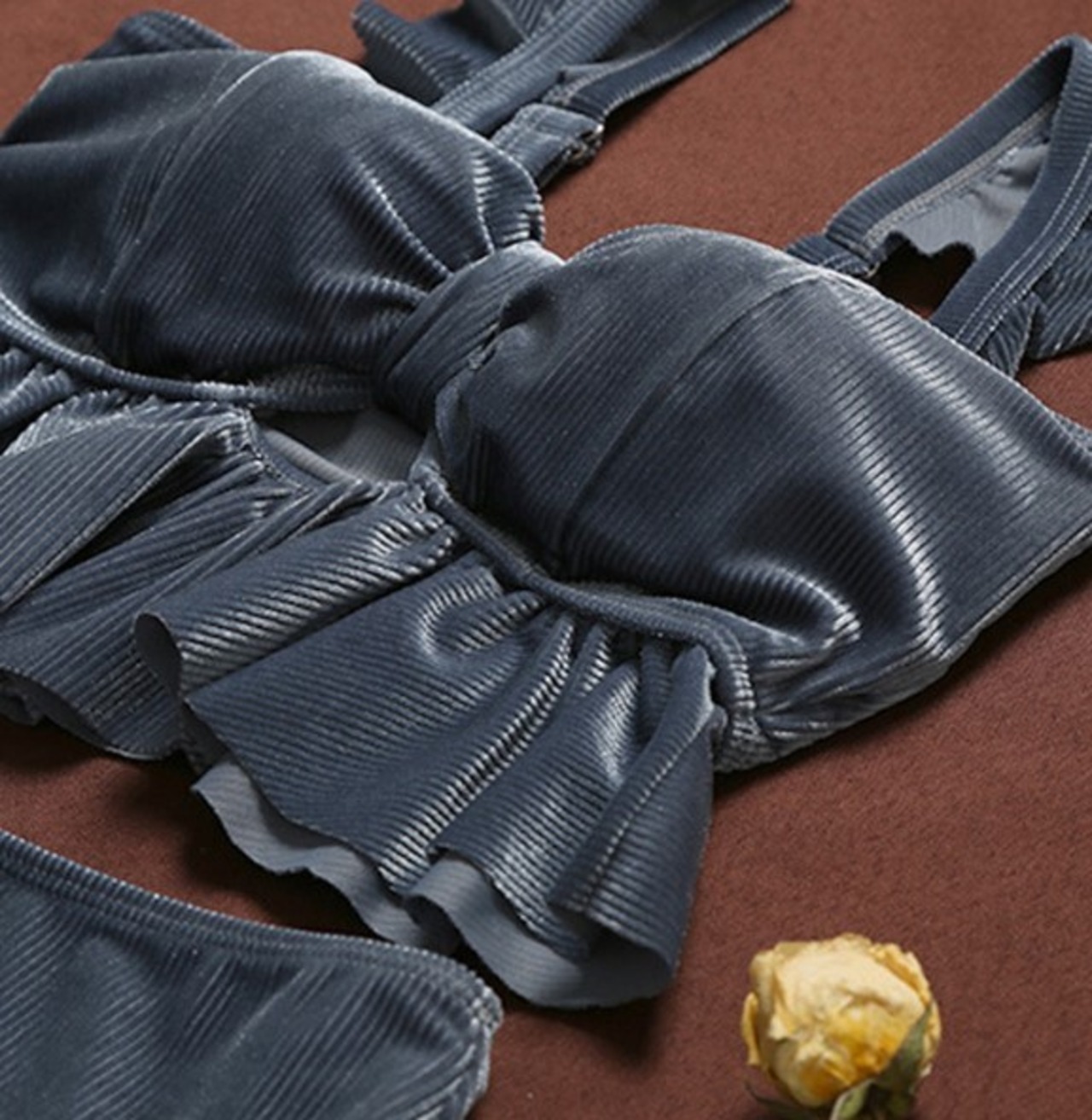 水着 ビキニ タンキニ 3点セット スプリット フリル セクシー シースルーパンツ ベルベット風 ガーリー プチプラ ブルー ab1745