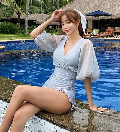 ワンピース水着 水着 レディース ビーチ リゾート 異素材 フレアスリーブ Vネック フリル 体型カバー ママ水着 無地 ab1760