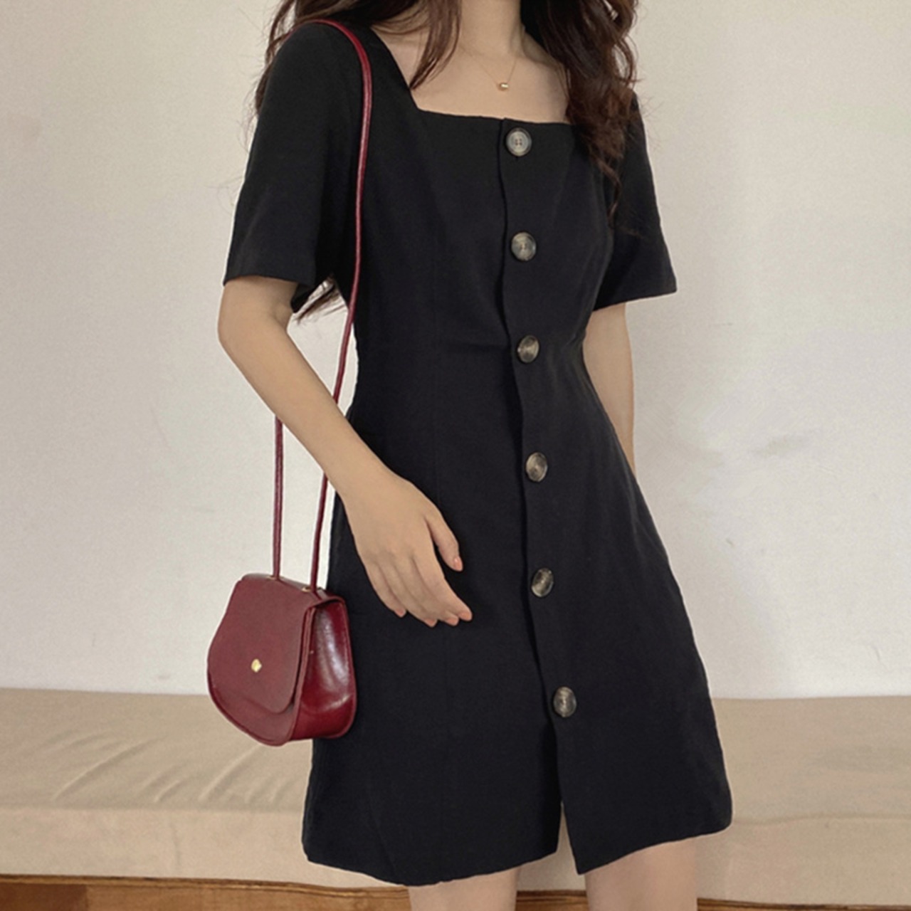 ワンピース ミニ丈 スクエアネック 前ボタン シンプル きれいめ Aライン ママコーデ デート お出かけ MH2084