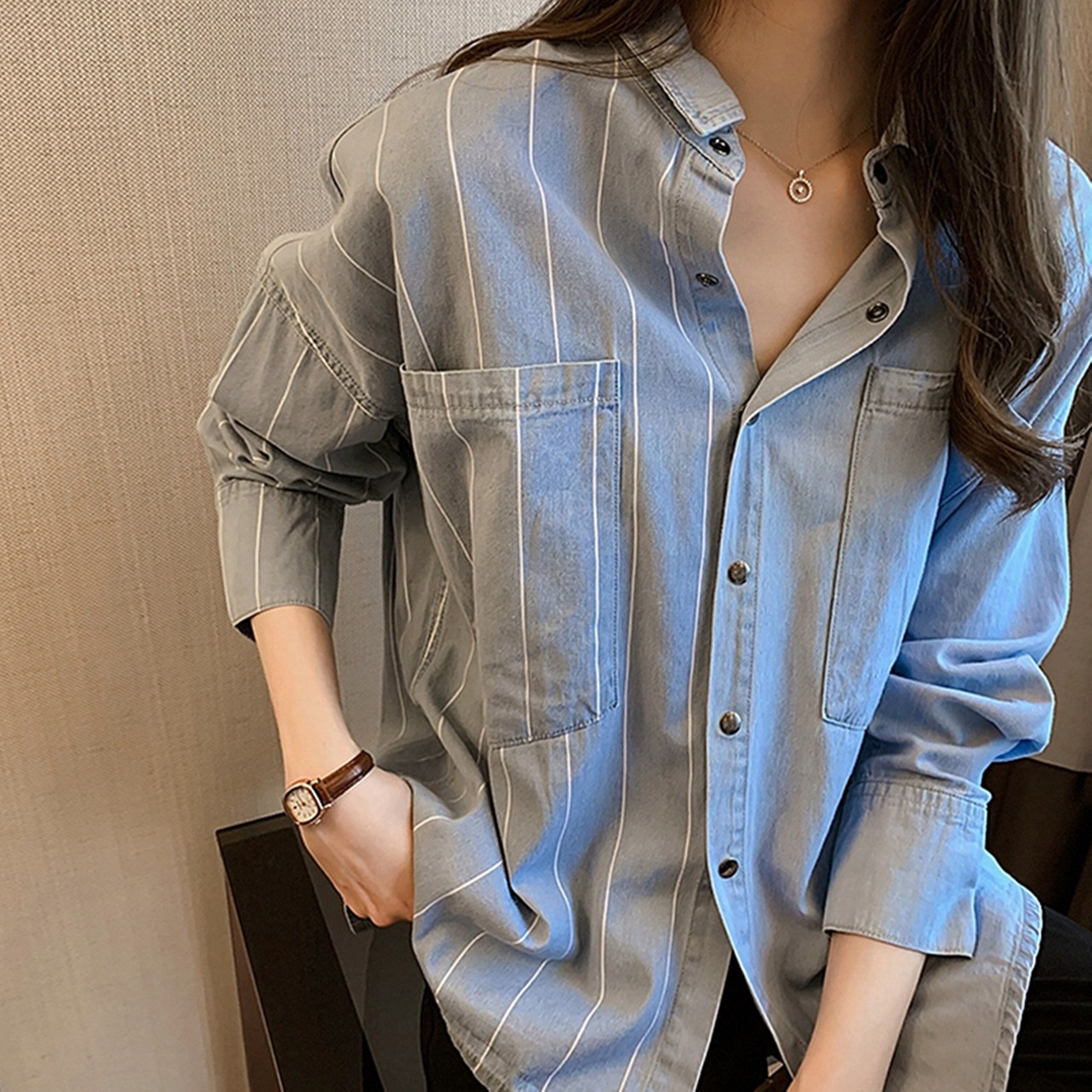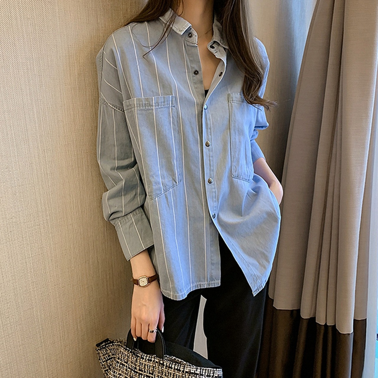 デニムシャツ デニム ストライプ シャツ 長袖 トップス カジュアル ママコーデ ゆったり 大きいサイズ デート お出かけ MH2162
