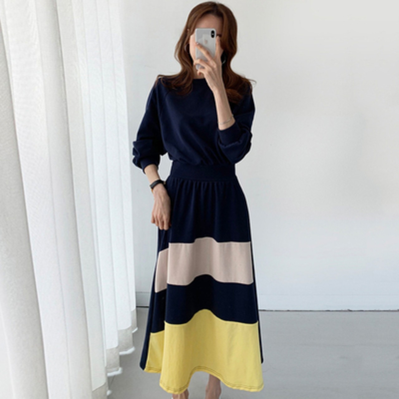 ワンピース ロング丈 長袖 ブロックカラー バイカラー 大人可愛い ママコーデ 通勤 デート お出かけ MH2255