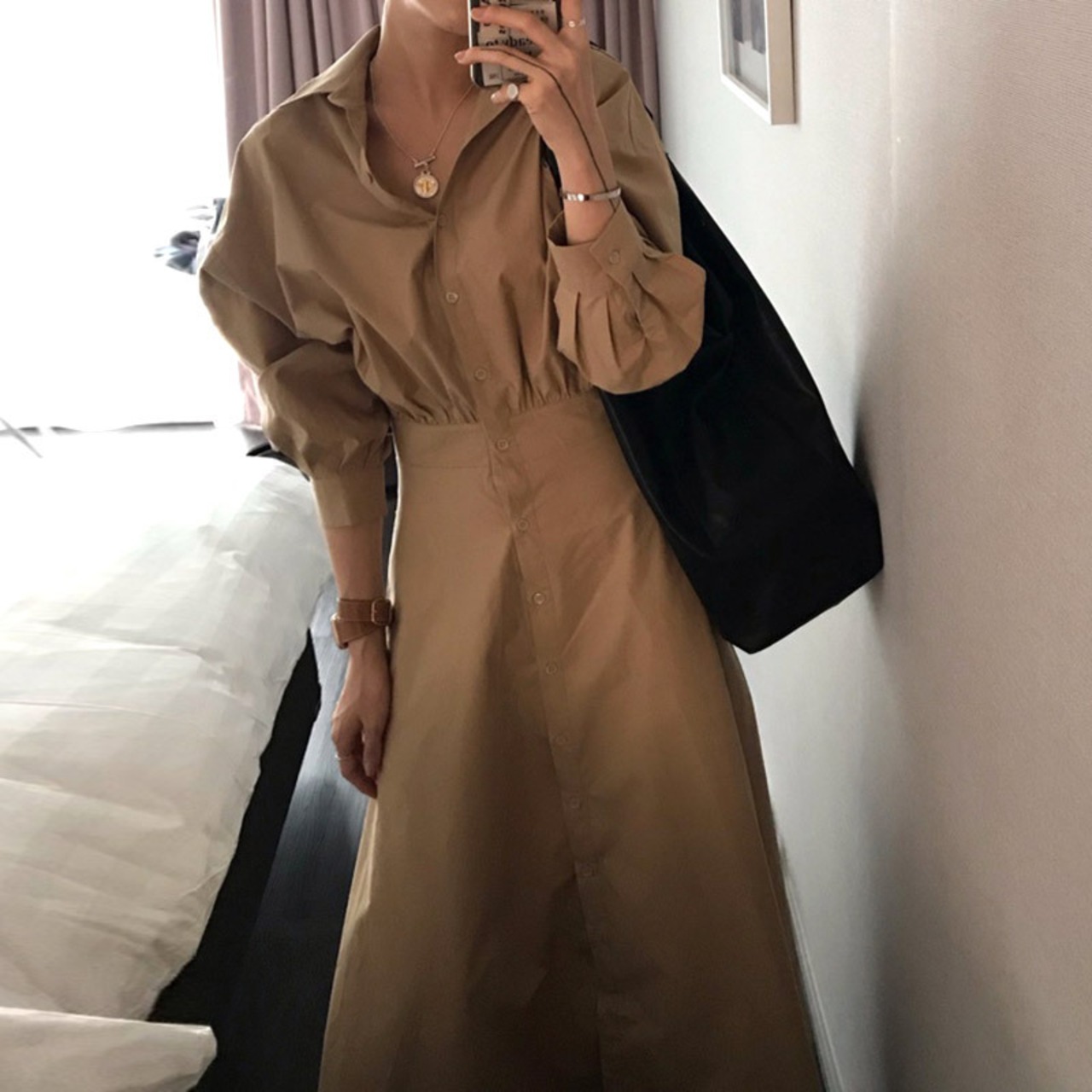 ワンピース シャツワンピース ロング丈 Aライン 長袖 Vネック 大人っぽい おしゃれ 大人可愛い カジュアル MH2283