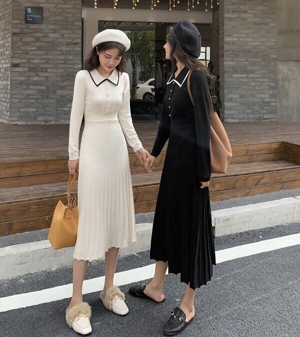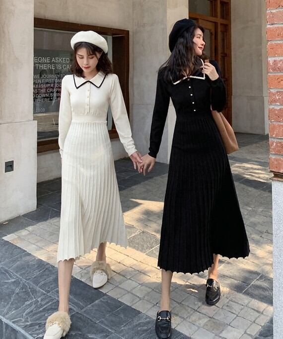 ワンピース ミモレ丈 レディース 秋冬 長袖 プリーツスカート Aライン ガーリー ニット プチプラ 無地 ab1805