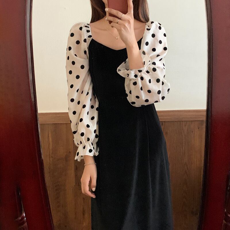ワンピース ベロア ドット柄 ミモレ丈 秋 レトロ 長袖 ママコーデ ガーリー 記念日 デート お出かけ MH2329