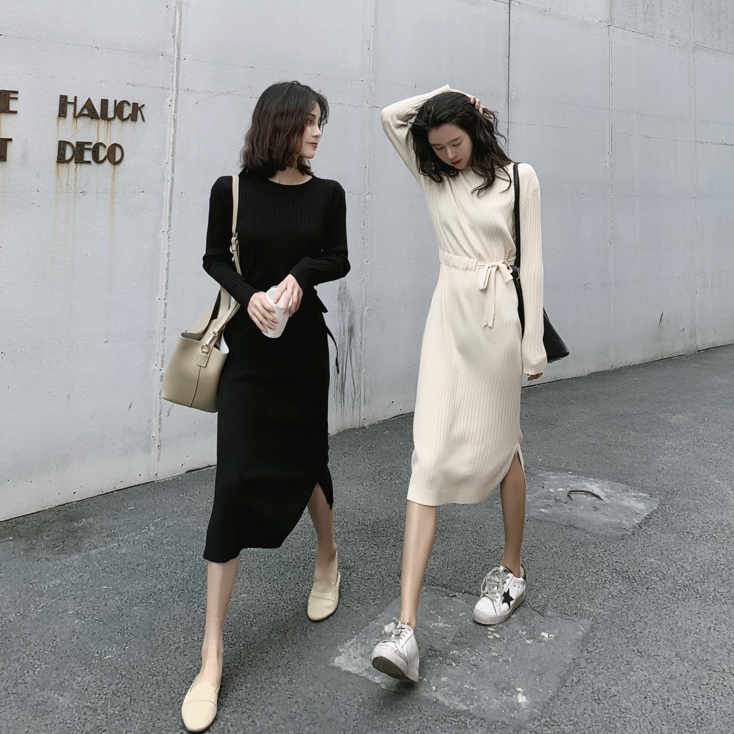 ワンピース ニット 長袖 ロング丈 無地 シンプル スリット入り ママコーデ デート お出かけ 秋冬 MH2336