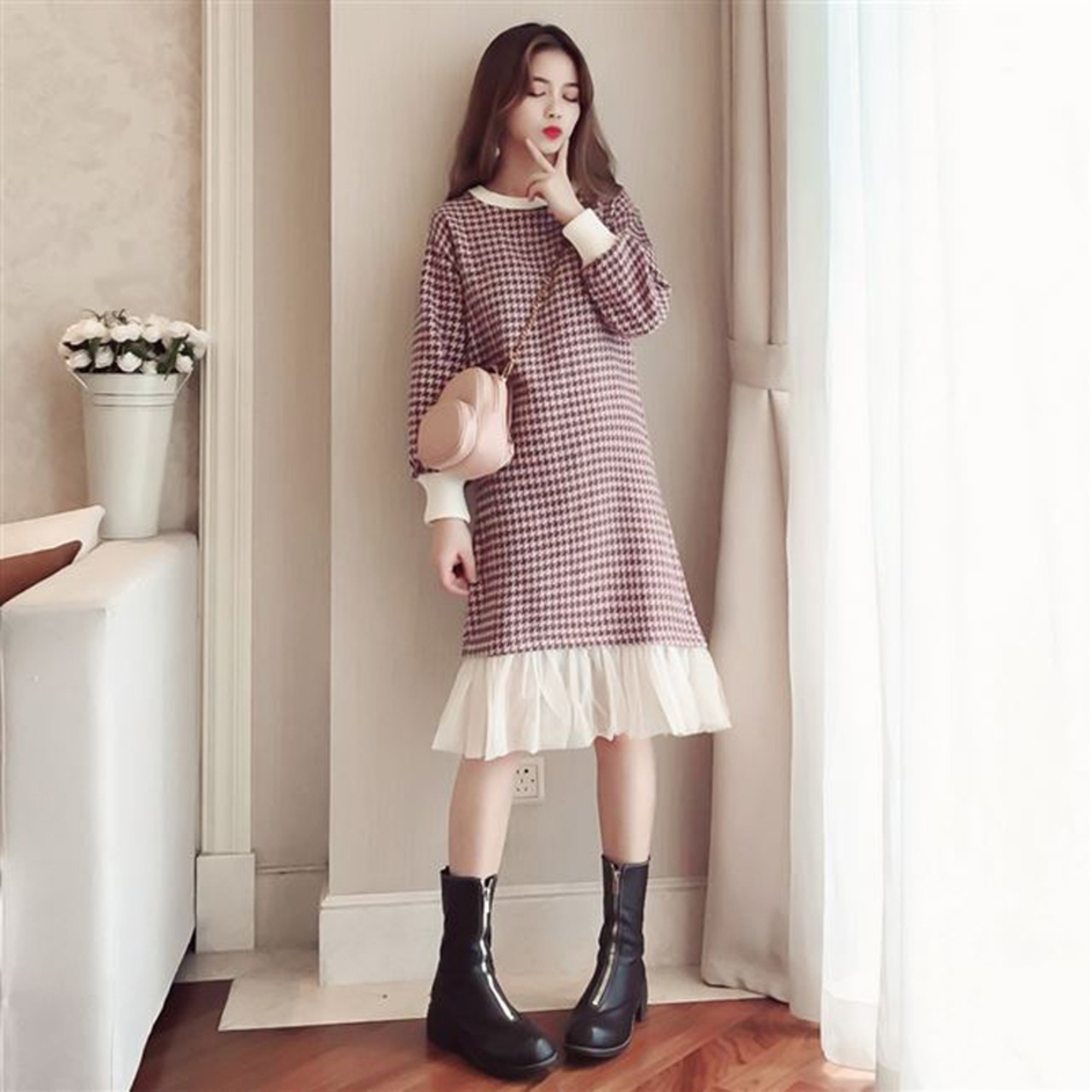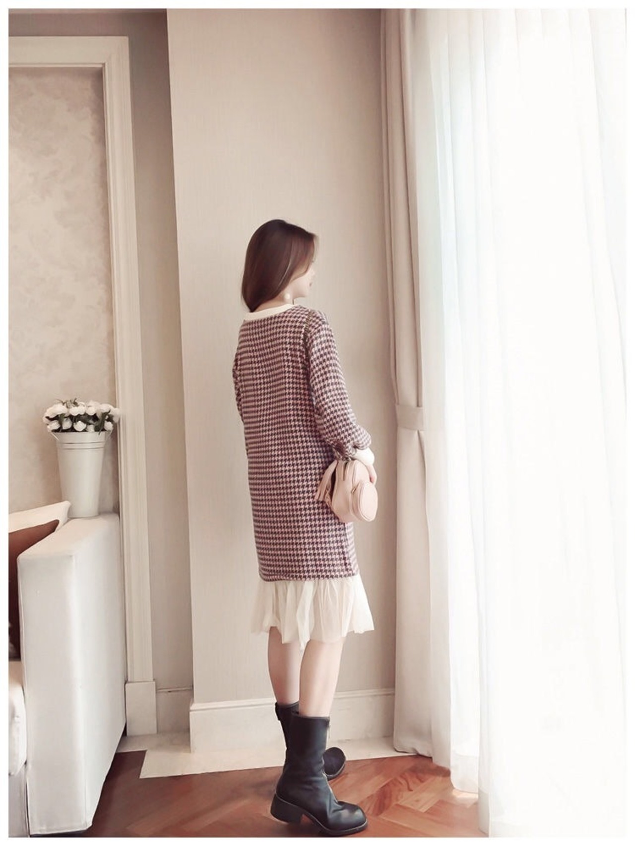 ワンピース 長袖 ラウンドネック 千鳥格子 チュールスカート ガーリー フェミニン ママコーデ デート お出かけ お呼ばれ MH2366